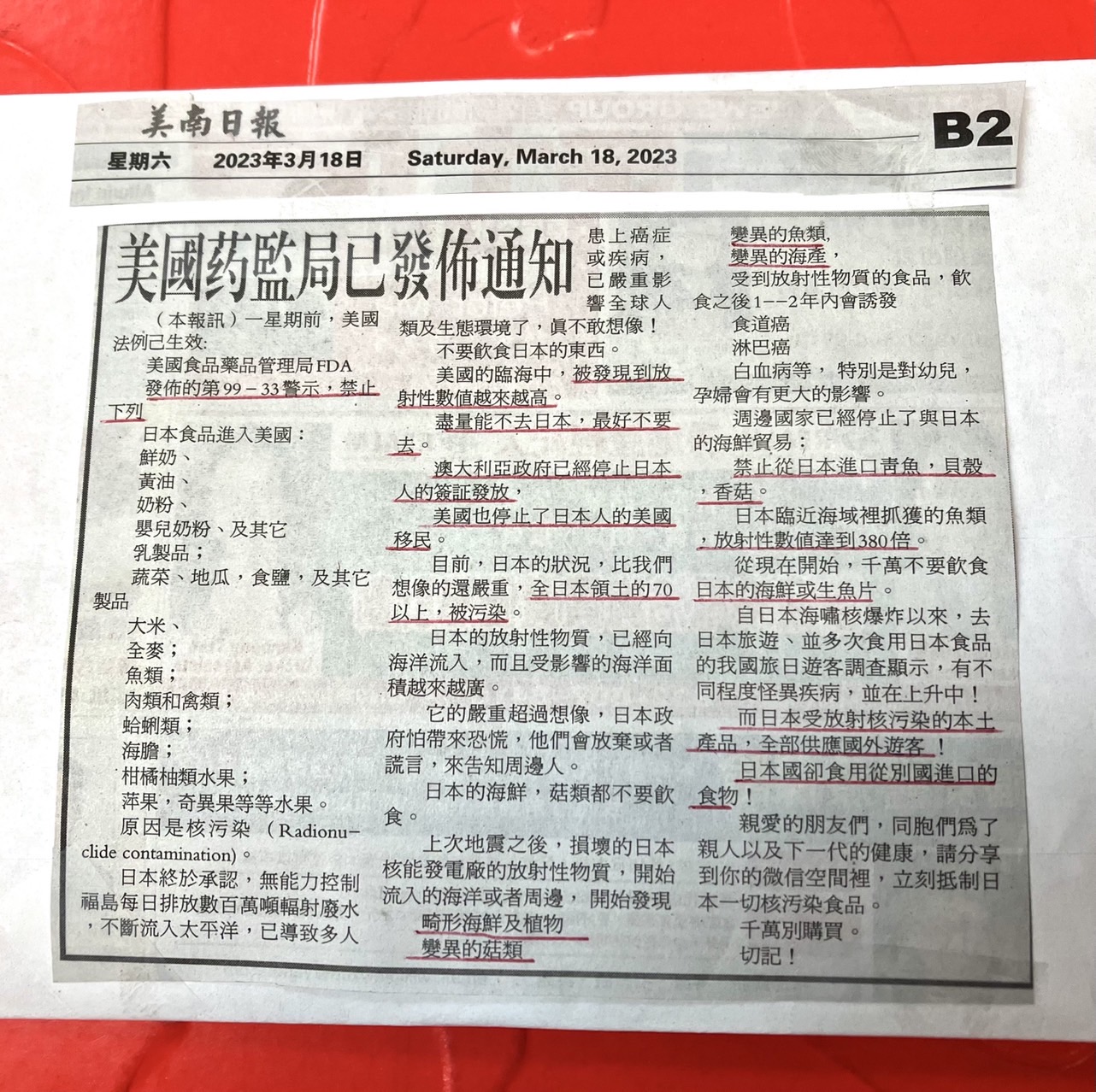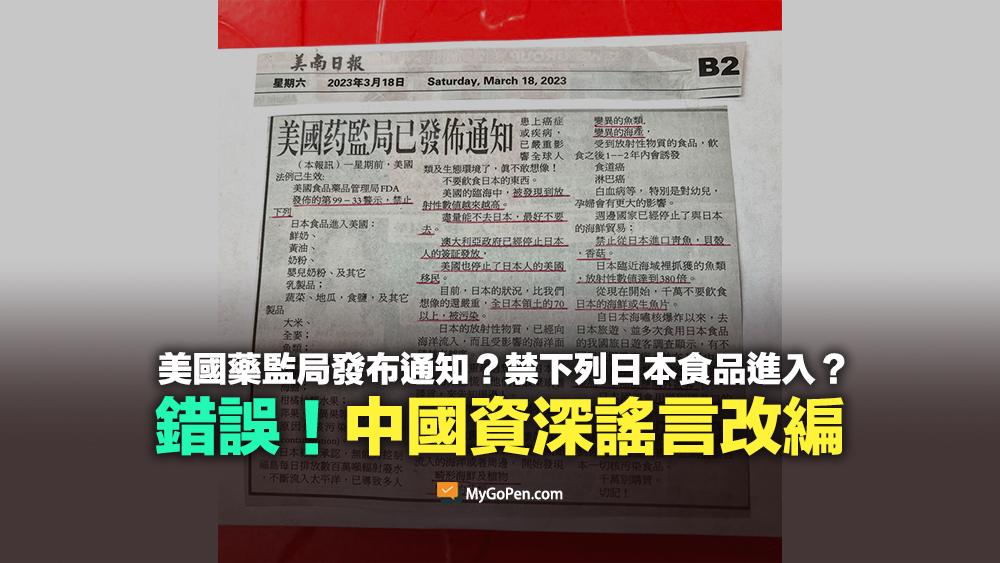 網傳「美國藥監局發布通知禁止下列日本食品進入美國」的訊息及新聞報導圖片。經查證,網傳圖片內容來自美南電子報 2023 年 3 月 18 日的圖卡;此訊息流傳已久,2015 年先在中國的網路上出現,後來改編成各種版本。美國 FDA 在 2015 年發布的 Alert #99-33 文件是針對日本特定的食品進行管制,該文件只是一份指引,讓相關單位可以免驗查扣,並不是禁止日本食品進口,且 FDA 在 2021 年就已經宣布不再使用這份文件管制日本食品。