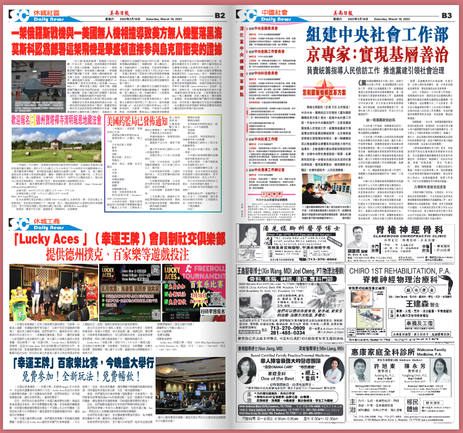 (一)網傳圖片中顯示為《美南日報》2023 年 3 月 18 日星期六 B2 版的報紙,以關鍵字檢索,找到「美南新聞電子報」網站,根據網站簡介,美南報系橫跨全美九大城市,首份報紙為「美南新聞」,於 1979 年 6 月 16 日在德州休士頓創刊發行。