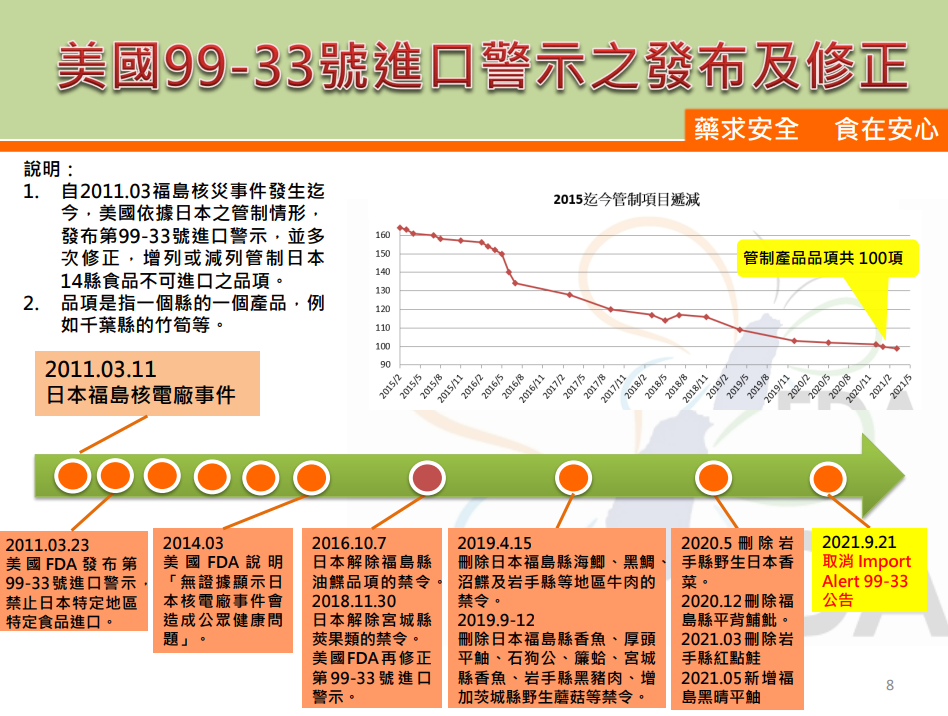 根據回應內容,美國 FDA 在 2021 年 9 月 21 日宣布「第 99-33 警示」(Alert #99-33)即日起失效。在審查了 10 年日本食品的抽樣結果後,確定從日本進口的放射性污染食品對美國消費者的風險非常低,FDA 決定不再需要這個警示來保護公眾健康,因此停用 #99-33。