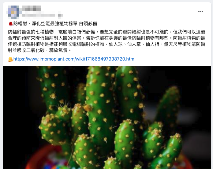 網傳「防輻射、淨化空氣最強植物榜單」的文章,宣稱仙人掌可以吸收電腦輻射,是防輻射植物。專家表示,仙人掌因為本身很厚、含水量高反射能力好,所以相比一般植物來說,抵擋電腦螢幕發出之電磁波輻射的能力確實更好,但其實只要東西夠厚、能夠產生陰影,擺在人和電腦螢幕中間就可以抵擋,可是正常情況下我們根本不會把仙人掌擺在正中間,因為會阻擋視線;但其實民眾並不需要太擔心,我們日常生活中常見的相關產品,不管是手機、電腦、微波爐等等,只要在合理的使用範圍內,其發出的電磁波能量強度都很弱,不會影響人體健康。
