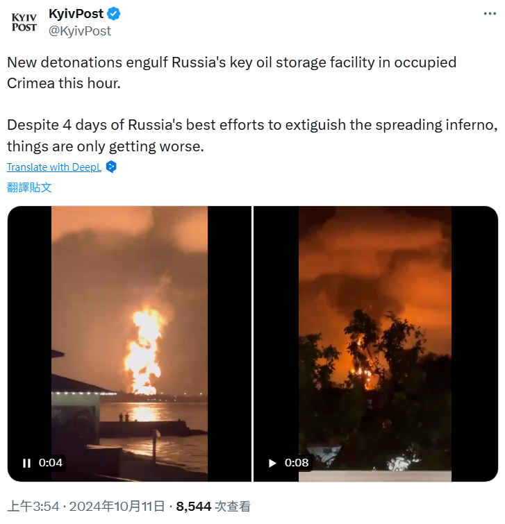 (二)透過影片反搜工具 InVID 分析片段二的關鍵畫面後進行搜尋,查找到《基輔郵報》(Kyiv Post)官方 X 帳號在 2024 年 10 月 11 日時曾發布相同的影片,推文中指出,俄羅斯佔領的克里米亞燃料儲存庫再次爆炸,雖然俄國努力救火,但情況只是變得更糟。