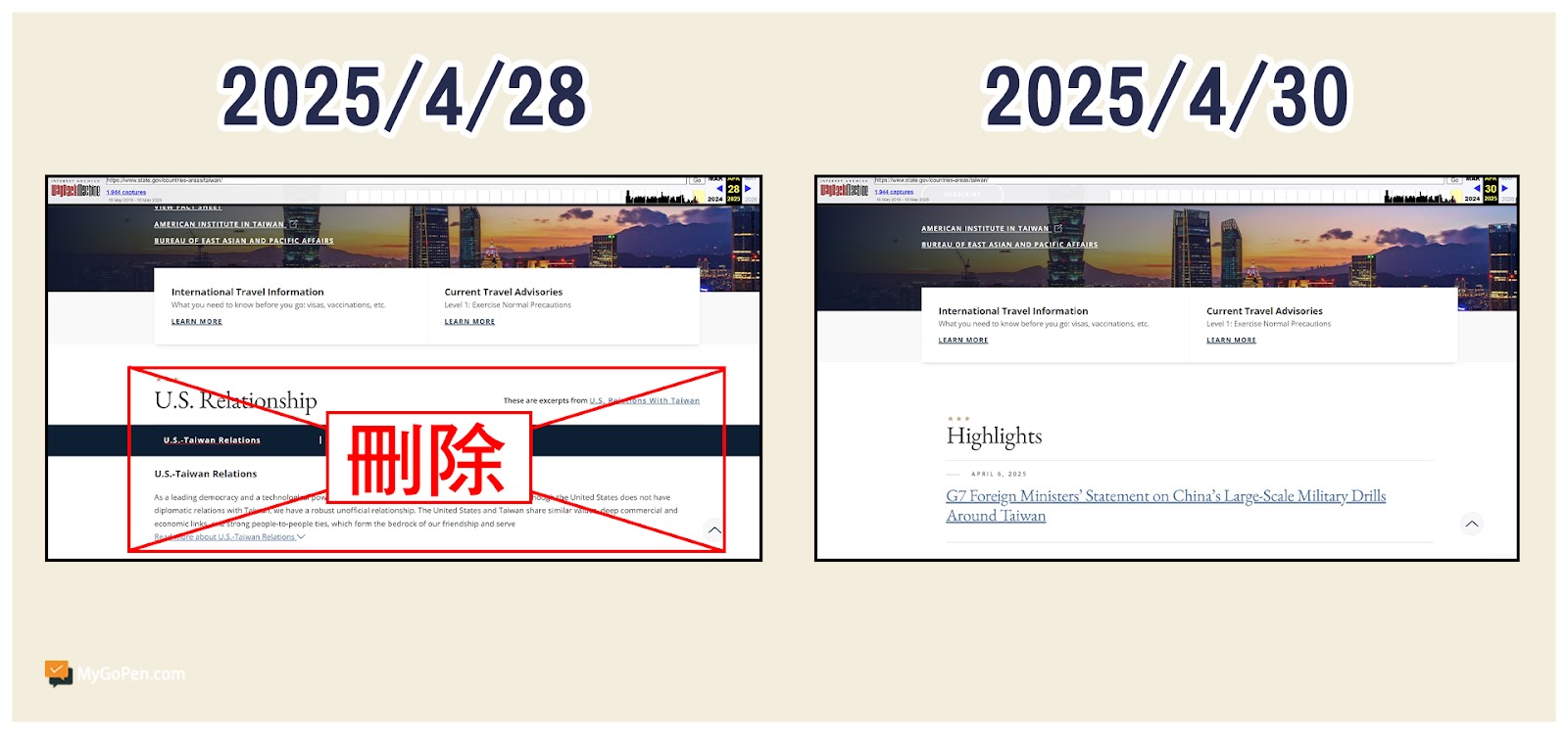 利用網頁存檔工具「WayBack Machine」檢視,會發現在 2025 年4 月 28 日之前,美國國務院網站仍保留「美台關係」的文字簡介,4 月 30 日時,相關文字已經刪除,僅保留旅遊資訊及川普總統上任後,美國發布有關台灣的聲明。