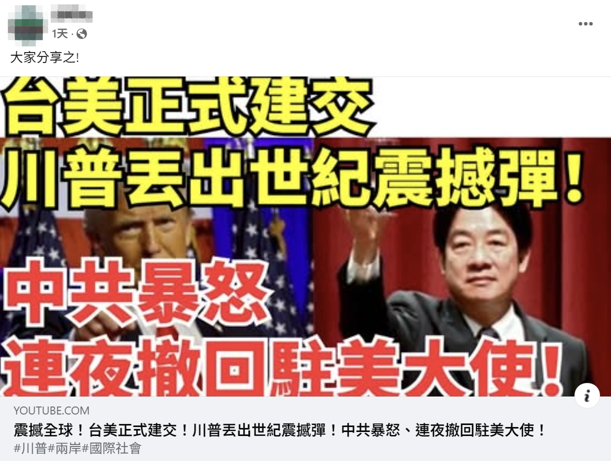 【錯誤】川普宣布「重大消息」?美台正式建交?不實內容!內容農場虛構影片