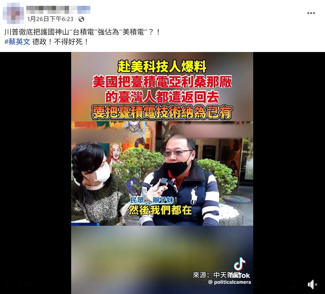 有關影片中的男子,MyGoPen 無法獨立查證他是否為台積電員工,至於他提到「台積電員工被遣返回台灣」的說法,記者實際詢問台積電,公關處透過電子郵件回覆「傳言內容並非事實」。