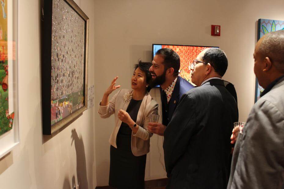 台北經濟文化辦事處徐儷文大使(左一)與來賓欣賞參展作品。圖/藝術銀行提供