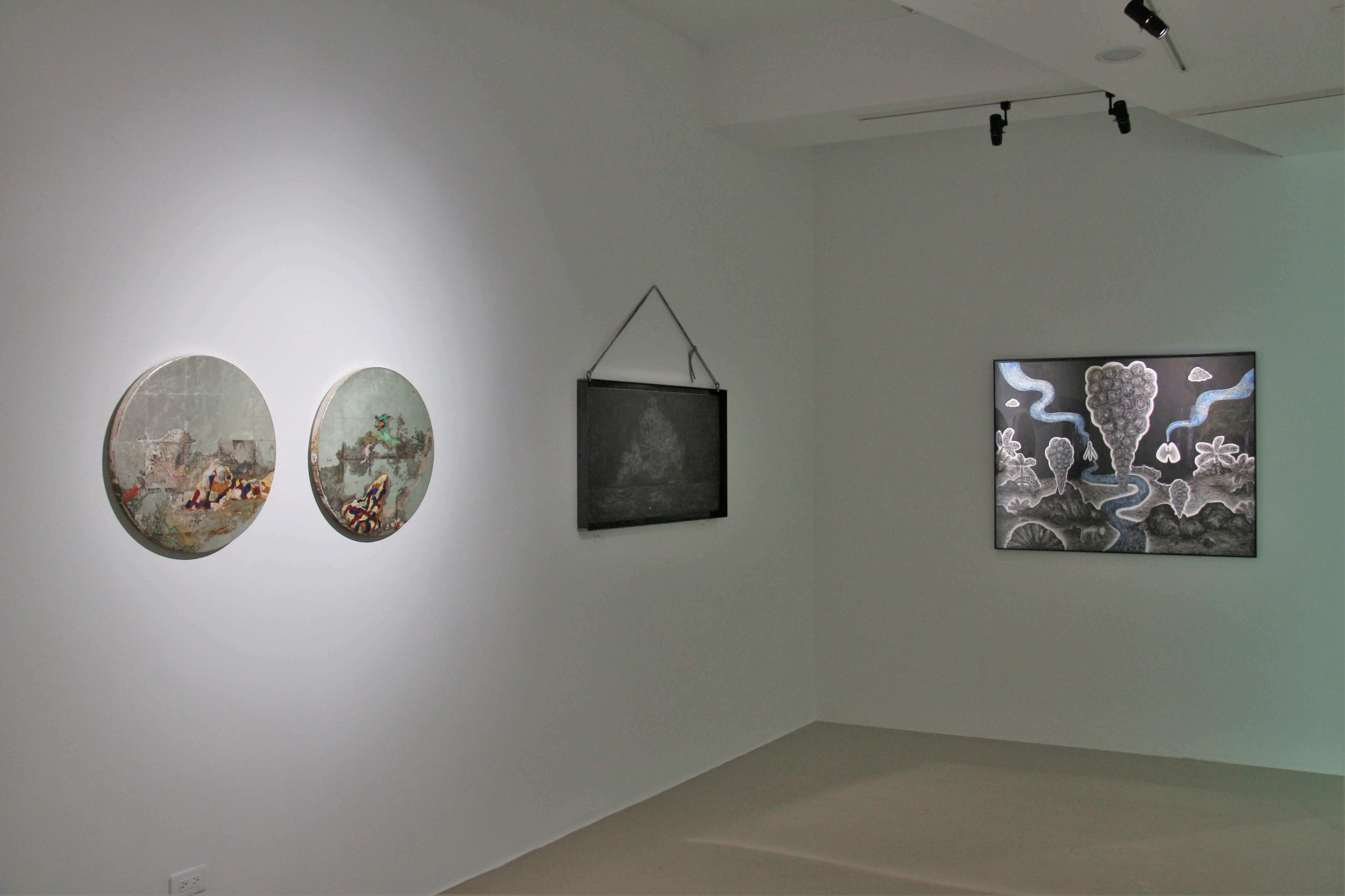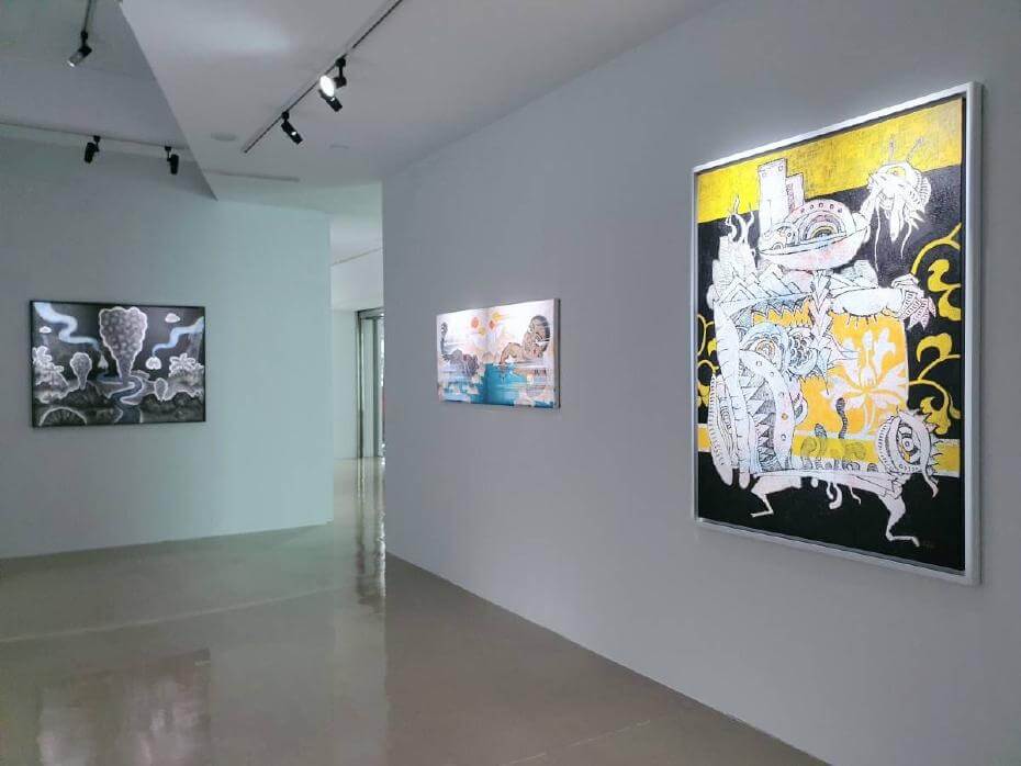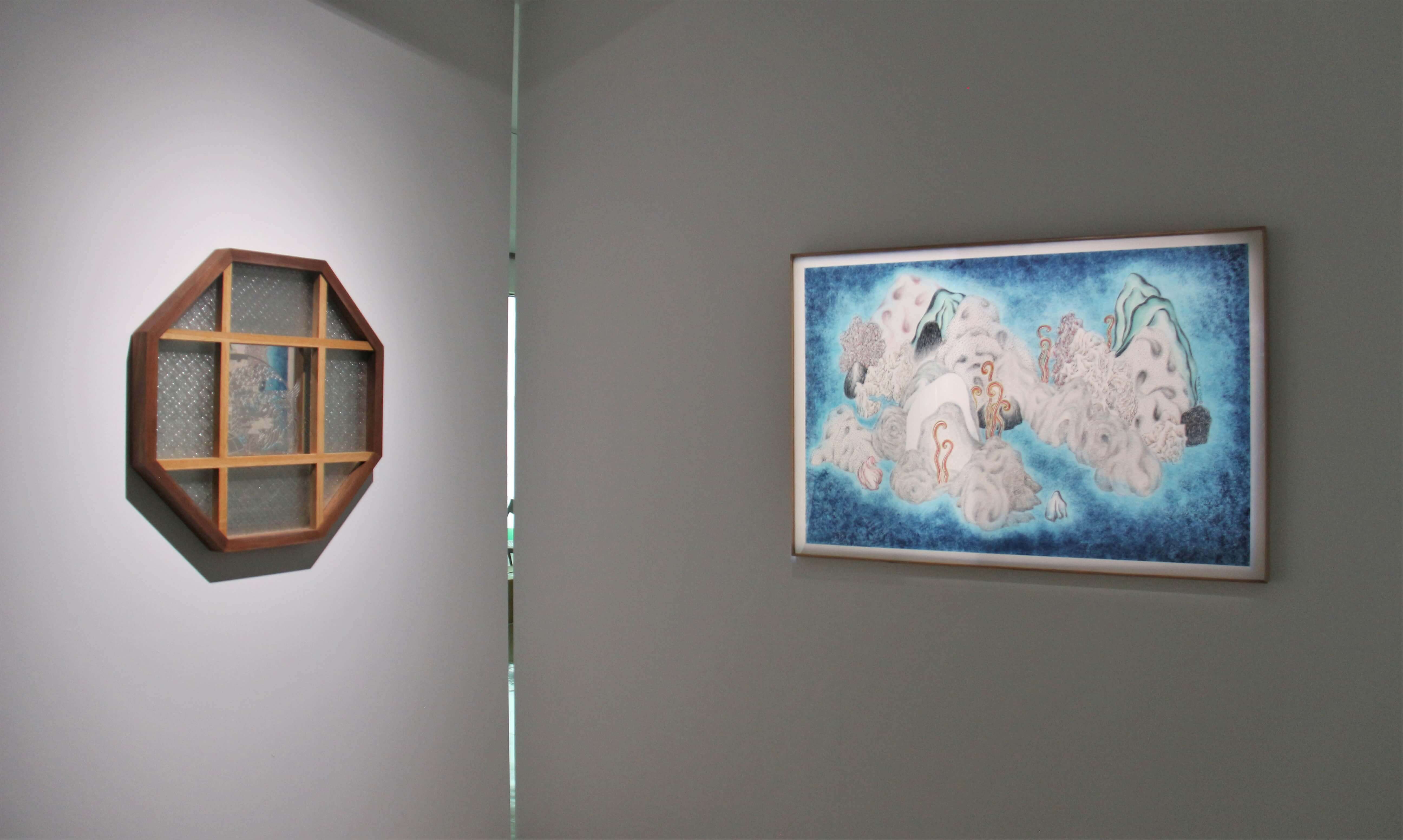 「OPEN ART BANK -剖開藝術銀行」首次曝光2020年購藏部份作品:(左)張碩尹,〈溪山清遠〉,素描;(中)華建强,〈這個夏天沒做好防曬 2〉,膠彩及(右)林威成,〈心中的日月〉,膠彩作品等多元媒材作品。圖/藝術銀行提供
