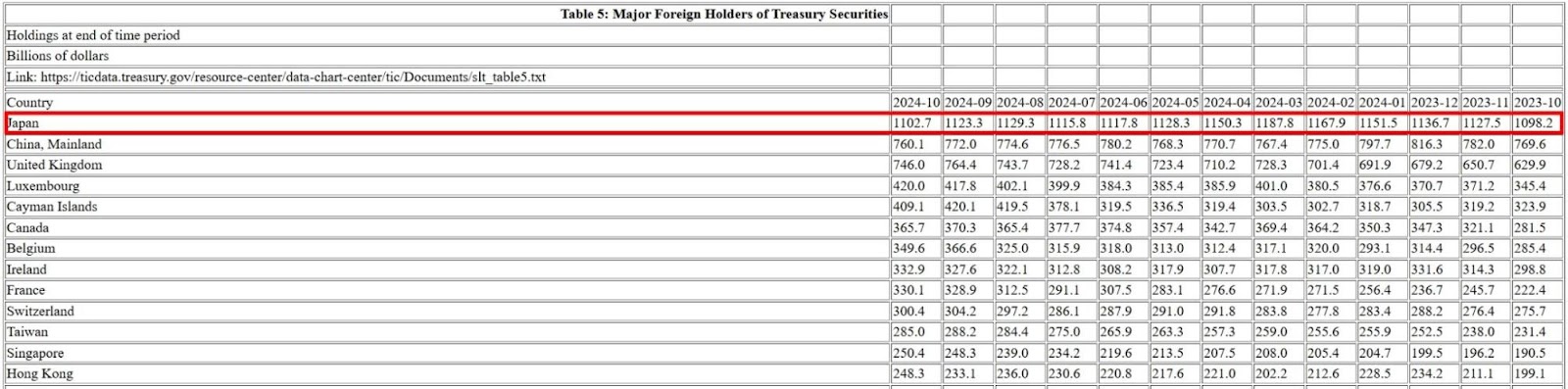 根據美國財政部編制的《國際資本流動報告》(Treasury International Capital, TIC),在《美國國債主要外國持有人表》(Major Foreign Holders of U.S. Treasury Securities)中,可以看到日本近一年來的美債持有變化,2023 年 10 月為 1 兆 982 億美元,2024 年 11 月為 1 兆 1,027 億美元,並沒有顯著變化。