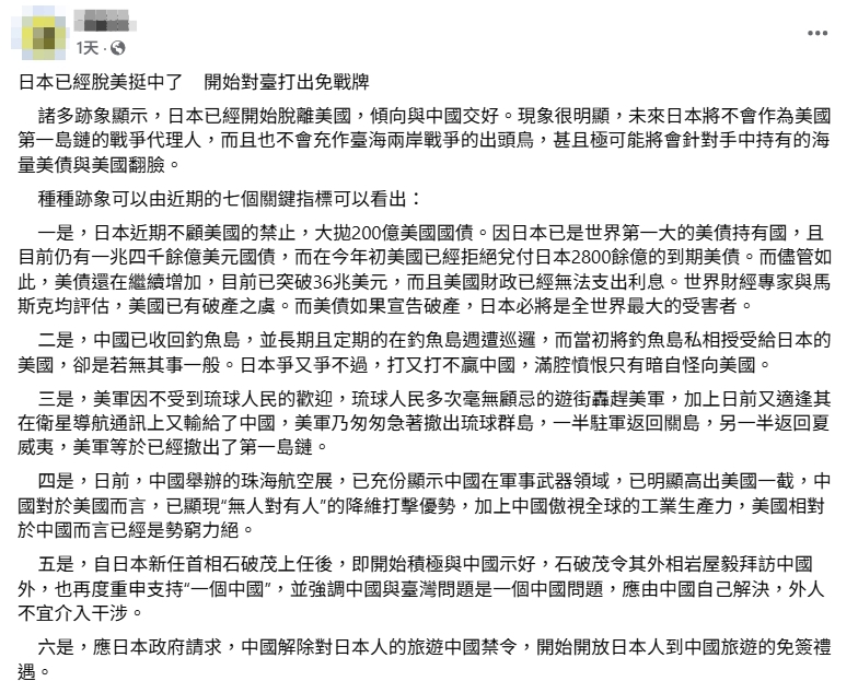 【錯誤】網傳日本「脫美挺中、對台打免戰牌」文章?誤導內容!多處與實際情況不符
