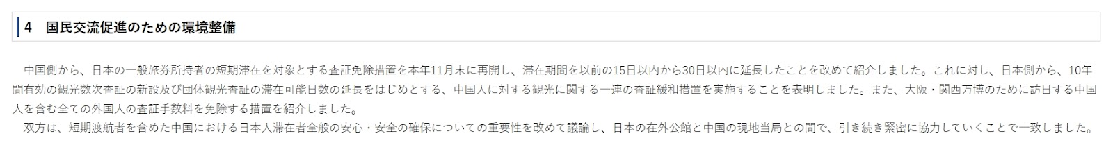 根據聯合新聞網於 2024 年 12 月 4 日的報導,中國政府於 11 月重啟對日本人短期滯留簽證的免簽措施,部分簽證申請手續將被簡化;中央社 12 月 25 日報導,日本外相岩屋毅與中國外長王毅會談後,確認中方將落實恢復日本水產品進口,而日本也將放寬中國人赴日旅遊簽證的發放條件。