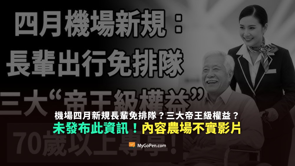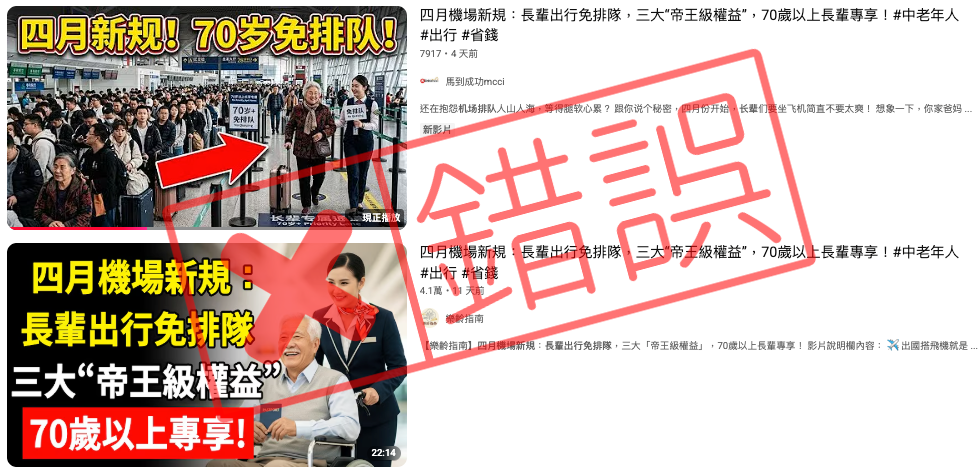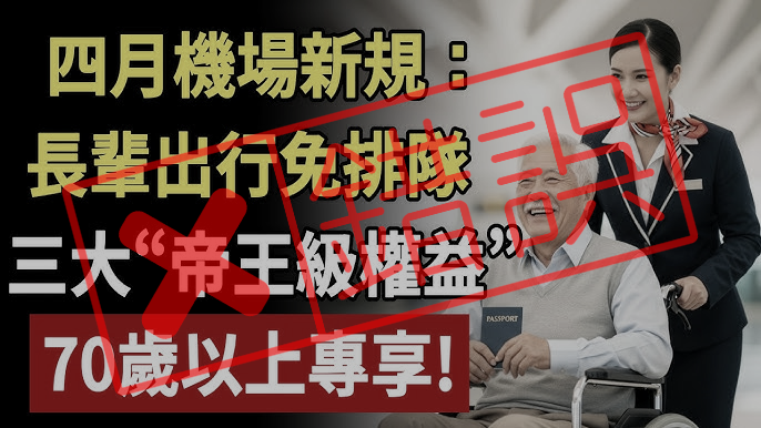 【錯誤】機場四月新規長輩免排隊?三大帝王級權益?未發布相關資訊!內容農場不實影片