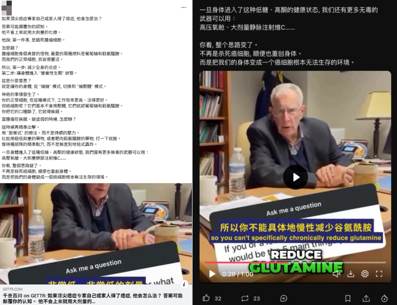 傳言提到「腫瘤細胞像個貪婪的怪物,最愛的兩種燃料是葡萄糖和穀氨醯胺」,「讓身體進入 "營養性生酮" 狀態」、「用 "脈衝式" 的療法」、「大劑量靜脈注射維C」,都與影片中的內容相符,而影片內容則為: