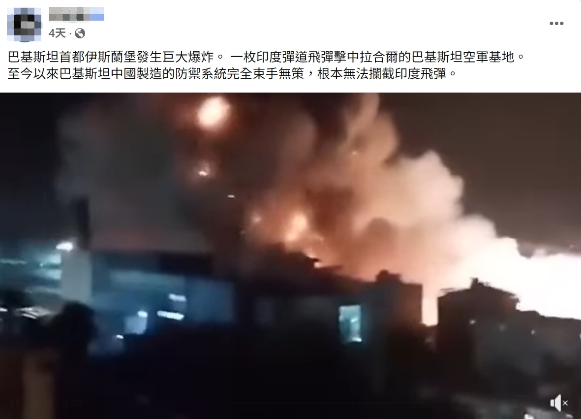 網傳「巴基斯坦首都發生爆炸」的影片及訊息,畫面顯示一棟建築物深夜突然發生大爆炸,聲稱是印度空襲巴基斯坦首都伊斯蘭馬巴德的影片,經查證,網傳影片實際拍攝於 2024 年 9 月 27 日,地點是黎巴嫩首都貝魯特東南部的 Chouaifet 地區,真主黨領導人哈桑納斯魯拉(Hassan Nasrallah)在該場空襲中身亡。網傳影片是 2024 年 9 月的新聞畫面,與 2025 年 5 月份印巴衝突無關,網傳訊息不正確。