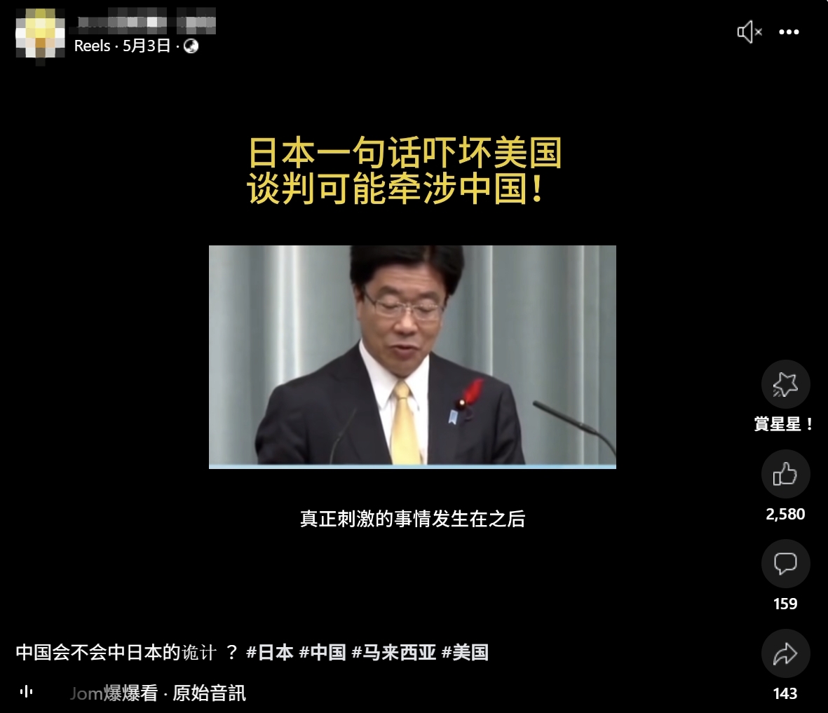 網傳「日本一句話嚇壞美國」的影片及訊息,內容聲稱日本與美國的第二輪關稅談判已經破裂,談判代表赤澤亮正已奉命退出談判,財務大臣加藤勝信則公開喊話,表示日本會將美債作為談判籌碼,並暗示美債中國也可以這麼做。經查證,日本於 2025 年 5 月 23 日與美國進行第三輪貿易談判,並未有「談判破裂」的情況,而且談判代表仍是赤澤亮正,沒有退出。加藤勝信於 5 月 2 日在東京電視台節目上,被問到美債是否可以當作談判手段時,他表示「把所有能成為談判籌碼的東西都擺上談判桌來討論,是理所當然的」,在被外界解讀為日本會以美債作為談判籌碼後,他已於 5 月 4 日澄清,表示當時只是在回答主持人的問題,並非指日本會這樣做,傳言曲解加藤勝信的發言,並夾雜許多錯誤資訊。