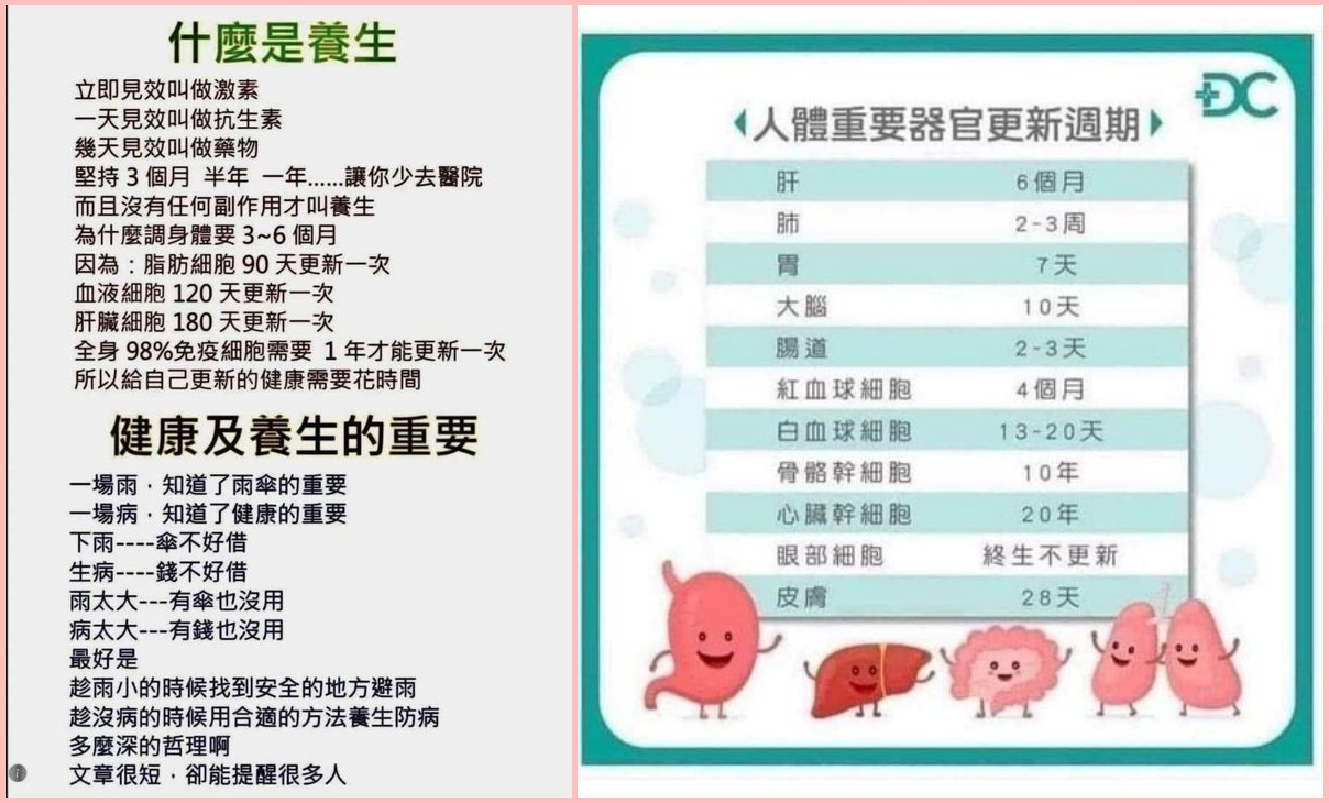 什麼是養生 立即見效叫做激素 一天見效叫做抗生素 幾天見效叫做藥物 堅持了 個月 半年 一年..…讓你少去醫院 而旦沒有任何副作用才叫養生 為什麼調身體要 3~6 個月 因為:脂肪細胞 90 天更新一次 血液細胞120 天更新一次 肝臟細胞 180 天更新一次 全身 98%免疫細胞需要 1年才能更新一次 所以給自己更新的健康需要花時間 健康及養生的重要 一場雨,知道了雨傘的重要 一場病 ,知道了健康的重要 下兩----傘不好借 生病----錢不好借 雨太大---有傘也沒用 病太大---有錢也沒用 最好是 趁雨小的時候找到安全的地方避兩 趁沒病的時候用合適的方法養生防病 多塺深的𠵍理啊 文章很短 ,卻能提醒很多人