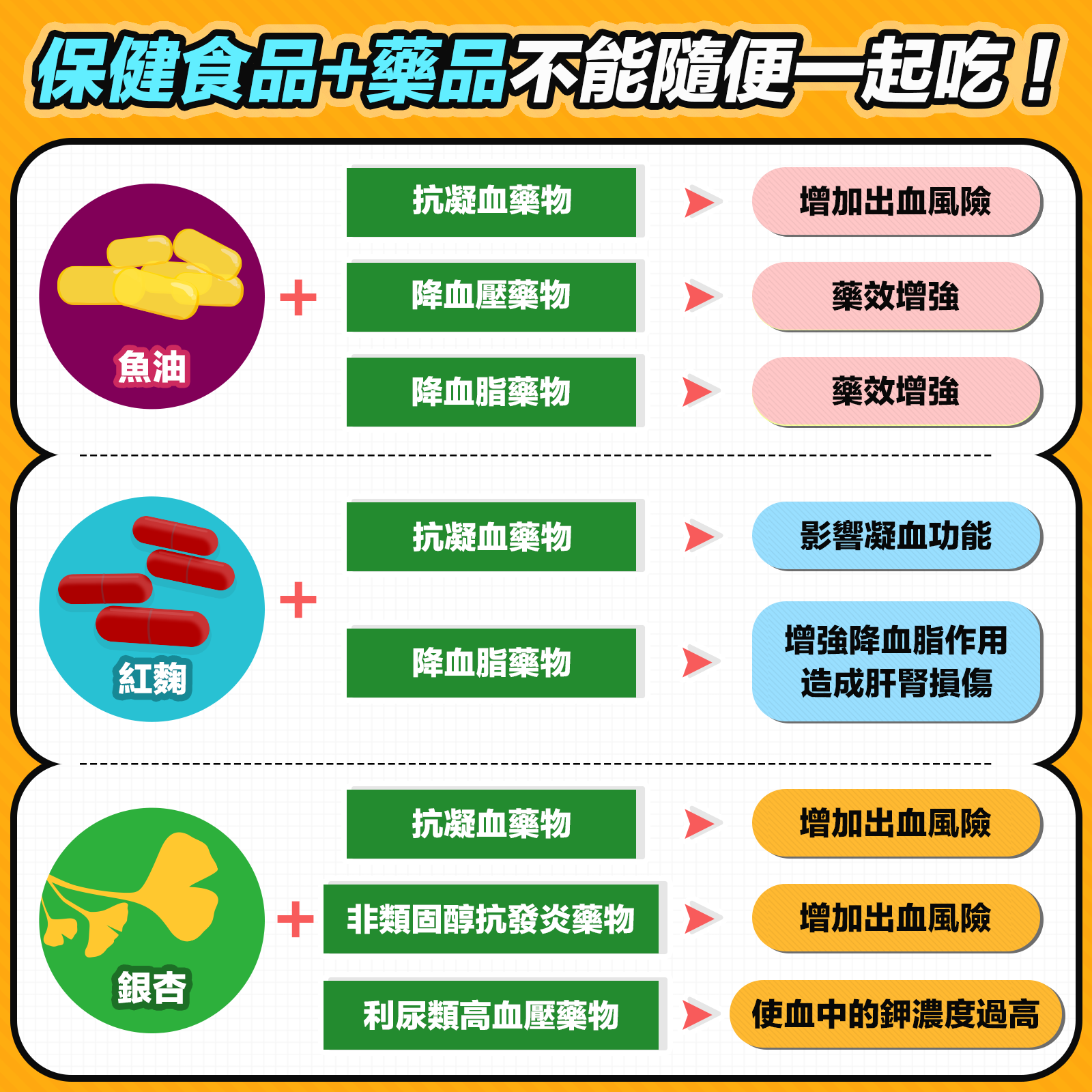 柳朋馳再以上述的降膽固醇藥物為例,曾有研究拿降膽固醇藥物與市售紅麴保健產品比較,在短時間內的比較下,藥物效果大降 40%、而紅麴只降 4%到 8%,藥品狂勝、保健食品根本不可能贏過藥物,而如果考量到操作的時間非常短、不到兩個月,將時間拉長的話紅麴也能夠達到更好的效果嗎?柳朋馳認為可以更好、但是也不會好到哪裡去。由於民眾對保健食品還是有需求,很多病人都是藥品、保健食品雙管齊下,柳朋馳建議民眾不管是吃「健康食品」或是「保健食品」,在一開始吃的時候、以及吃一段時間之後,都應該有定期想一下、評估效果的習慣,有慢性病的病人在吃健康食品、保健食品前,都應該跟醫生討論,避免交互作用降低藥效,或是同向的加乘作用導致治療過度引發別的問題。