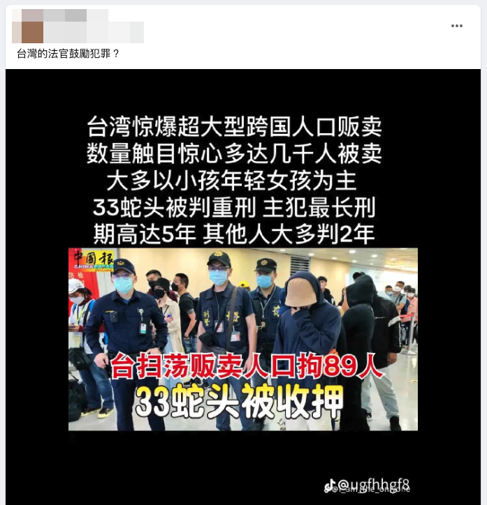 網傳「台灣法官鼓勵犯罪」、「台灣驚爆超大型跨國人口販賣」的訊息和圖片。經查證,網傳圖片實為 2022 年柬埔寨工作詐騙案的舊照,當時有 7 名疑似落入跨國工作陷阱的國人搭機返台,由航警局刑警大隊陪同通關入境,協助相關單位調查;而傳言提到的「33 蛇頭」這個數字,是統計至 2022 年 8 月 24 日有 33 人被收押,但案件持續偵辦中,後續統計至 8 月 28 日,全台警方及法務部調查局共逮捕 138 人、39 人收押。此案件是台灣黑幫和海外黑幫配合,誘騙大量台灣人至海外的犯罪案件,受害人數並未如傳言所述高達幾千人,目前也尚無涉案人士已經被判刑的資料,傳言為錯誤訊息。