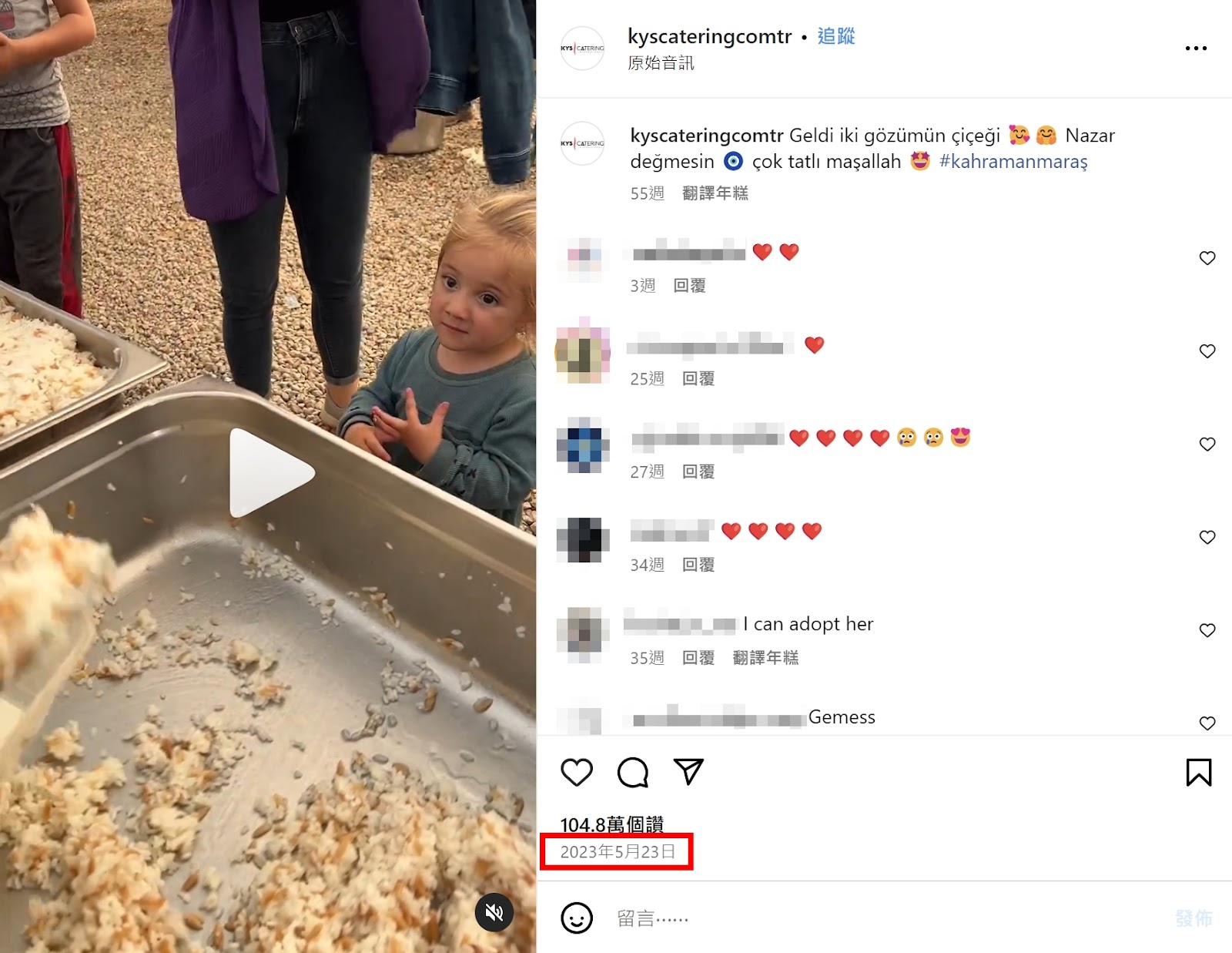 根據上傳用戶簡介,「kyscateringcomtr」是土耳其外燴公司KYS CATERİNG 的官方帳號,除了網傳片段外,該帳號於2023 年 4 月 18 日、7 月 6 日等皆發布過同一名小女孩的影片,並註明地點位於「卡赫拉曼馬拉什」(Kahramanmaraş),當地是 2023 年 2 月 6 日土耳其 7.8 強震的震央,網傳影片即為外燴公司前往災區協助災民的影片。