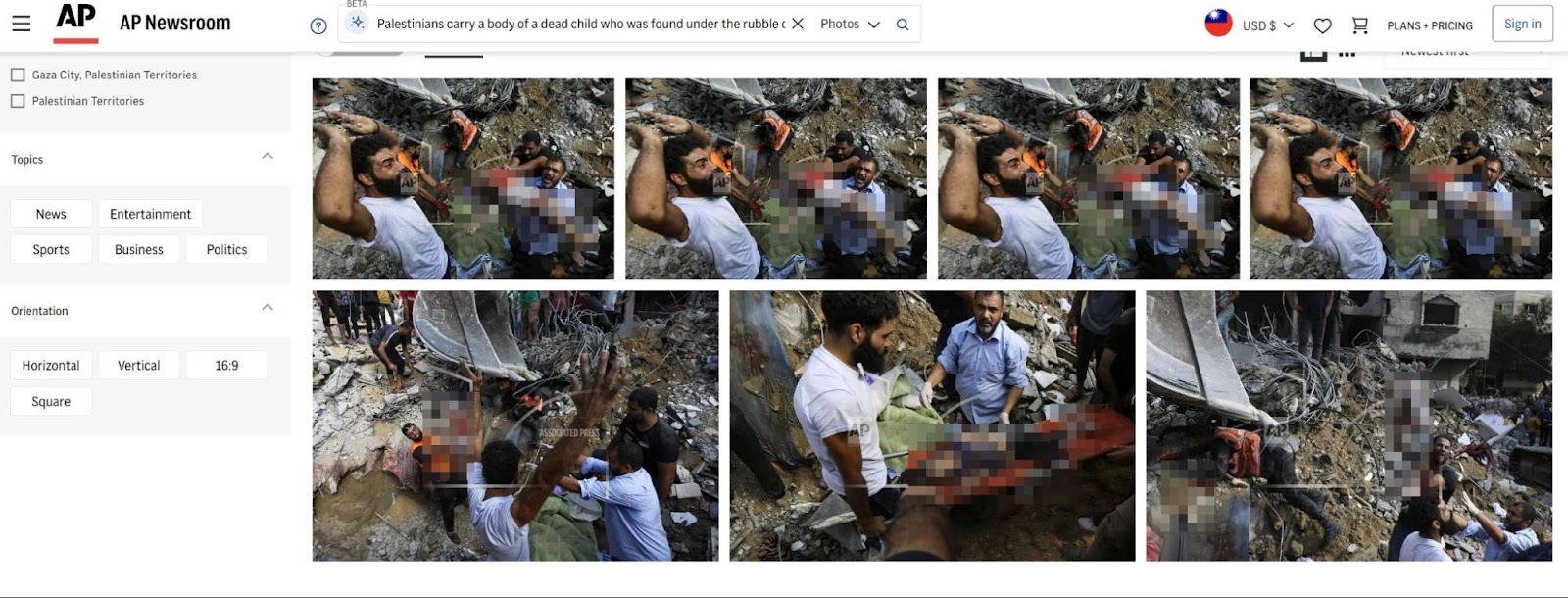 實際檢視美聯社圖庫,以「Palestinians carry a body of a dead child、GAZA City」等關鍵字進行搜索,可以找到與網傳影片相同場景、不同角度的照片,至此可以確認網傳影片中搜救人員的片段,確實是在加薩拍攝,不過拍攝的時間點為 2024 年 10 月 24 日。