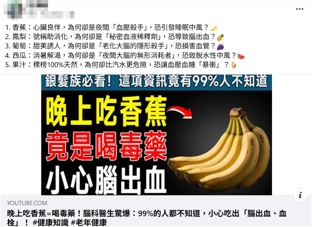 網傳「晚上吃香蕉=喝毒藥」、「小心吃出腦出血、血栓」的影片,片中提到傍晚吃太多香蕉,或是吃鳳梨、葡萄、西瓜、果汁,都會增加中風風險。但專家表示,天然食物如果依照衛福部等具代表性機構所《每日飲食指南手冊》、《老年期營養手冊》所建議的份量、頻率,依「多元、均衡」的原則,所獲取的養分並不會造成嚴重的疾病症狀,傳言誇大、聳動,傳言為部分錯誤、部分易誤導的訊息。