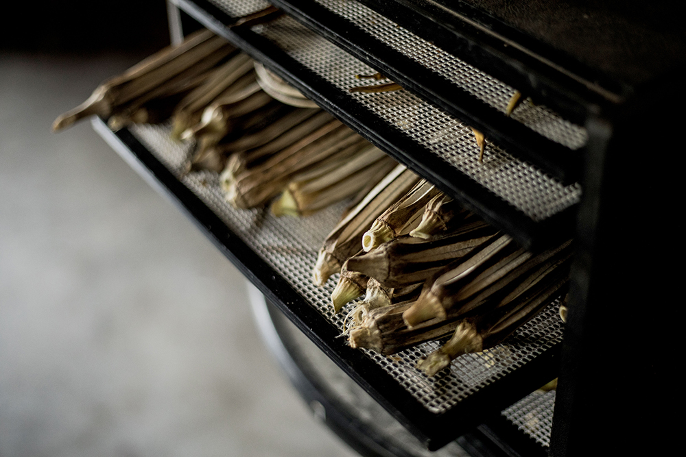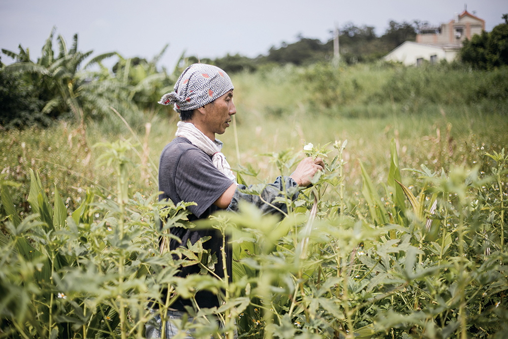 農夫、醫師、樂手,這天等著我們到訪的黎旭瀛是位農人,三芝番社前有座「幸福農場」,外頭直立整齊稻草擺放著,裡頭各式乾果、稻草隨性倒掛,開放式廚房在紅磚厝中格外醒目,空氣中散佈著秋葵烘乾後的香味,他安排了除草、採收秋葵,一個上午大夥在農場悠閒穿梭。「開始的契機是女兒得了異位性皮膚炎,想要讓她吃健康食材調整體質,當醫生會知道用什麼藥最快能達到療效,但治標不治本,最快可以改變生活型態其實是「飲食」,便開始種起健康、自然的食材。這樣做之後,女兒異位性皮膚炎半年就好了!所以才知道飲食真的是很重要。十幾年前找到這塊地,趁著工作外,利用空閒時間投入農耕,技術方面邊做邊學,由失敗中學習,幸好有很好的前輩指點,還有自己不斷的藉著實作學習。當你更仔細觀察作物生長變化,傾聽自然的聲音,你會發現真正老師是自然本身,而不是書上生硬的法則。」 幸福農場有著農人體驗,為的是讓更多的人能了解健康的食材得來不易,友善農地耕作方式成了每個人應有的知識。