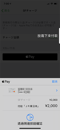 以我自己是選擇 2000 円,沒問題的話就點選Apple Pay,進行付款的動作