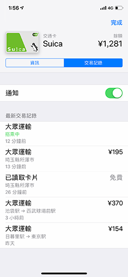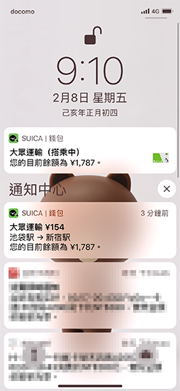 而且你的所有進出站資訊(含你在搭乘中),Suica APP 都會推播給你