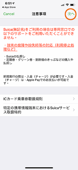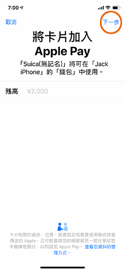 付款完成後,就可以把這張 Suica 西瓜卡加入Apple Pay 錢包中之中,點選 [下一步]