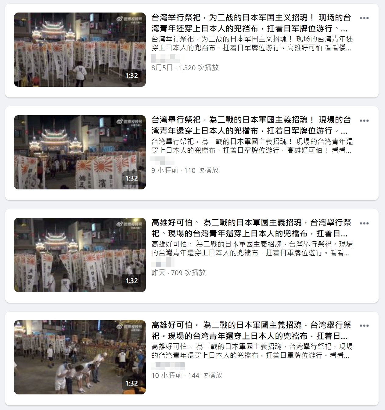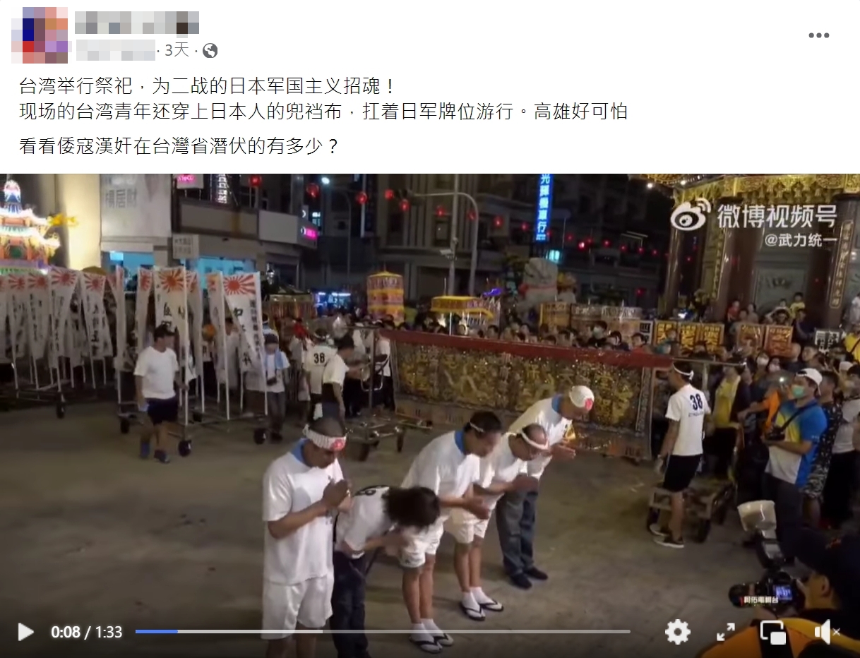 網傳「台灣舉行祭祀」的影片及訊息,畫面顯示轎班人員穿著日式兜襠布,一旁還有許多寫有日本人姓名的旭日旗,聲稱是台灣人在為日本軍國主義招魂。經查證,網傳影片拍攝於 2019 年 11 月 2 日,當時紅毛港濟天宮舉行平安遶境活動,邀請二十多間廟宇共襄盛舉,影片中出現的即為紅毛港保安堂陣頭,參與遶境活動時大多穿著日式服裝,這是因為該廟祭祀主神之一是「海府大元帥」,即二戰時沉沒的日本軍艦「蓬 38 號哨戒艇」艦長高田又男。網傳影片非近期片段,僅呈現保安堂參與遶境活動的畫面,無法依此作為「該廟為日本軍國主義招魂」的依據。