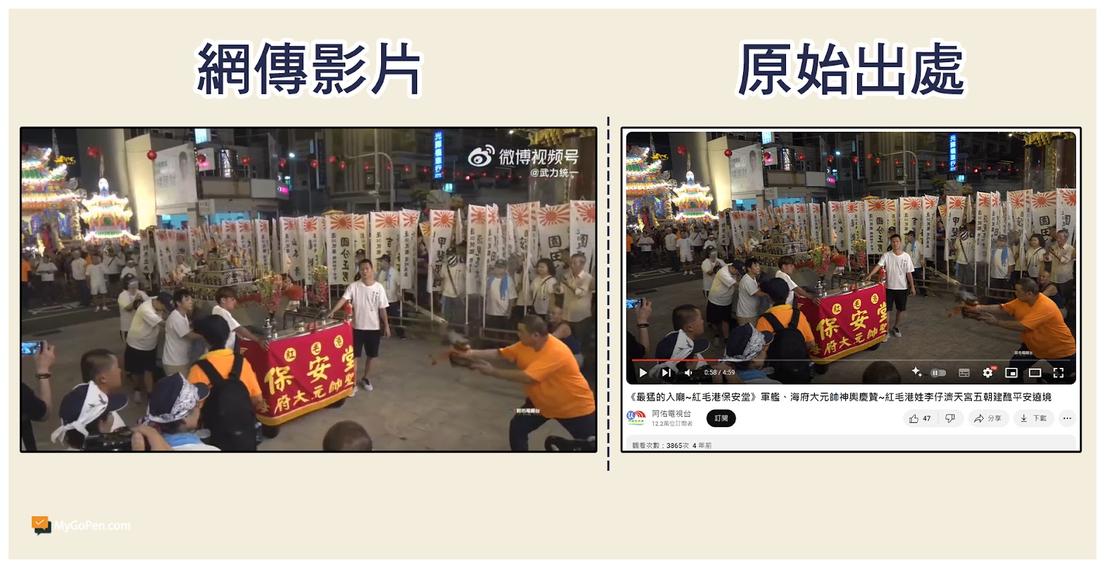 網傳影片 0:21 開始有拍到「紅毛港保安堂、海府大元帥」的字樣,以此在阿佑電視台的頻道內搜索,可以找到 2019 年 11 月 5 日上傳的影片《最猛的入廟~紅毛港保安堂 軍艦、海府大元帥神輿慶贊~紅毛港姓李仔濟天宮五朝建醮平安遶境》,經檢視後確認即為網傳影片原始出處,可以得知該片段為 2019 年的影片,並非近期拍攝。