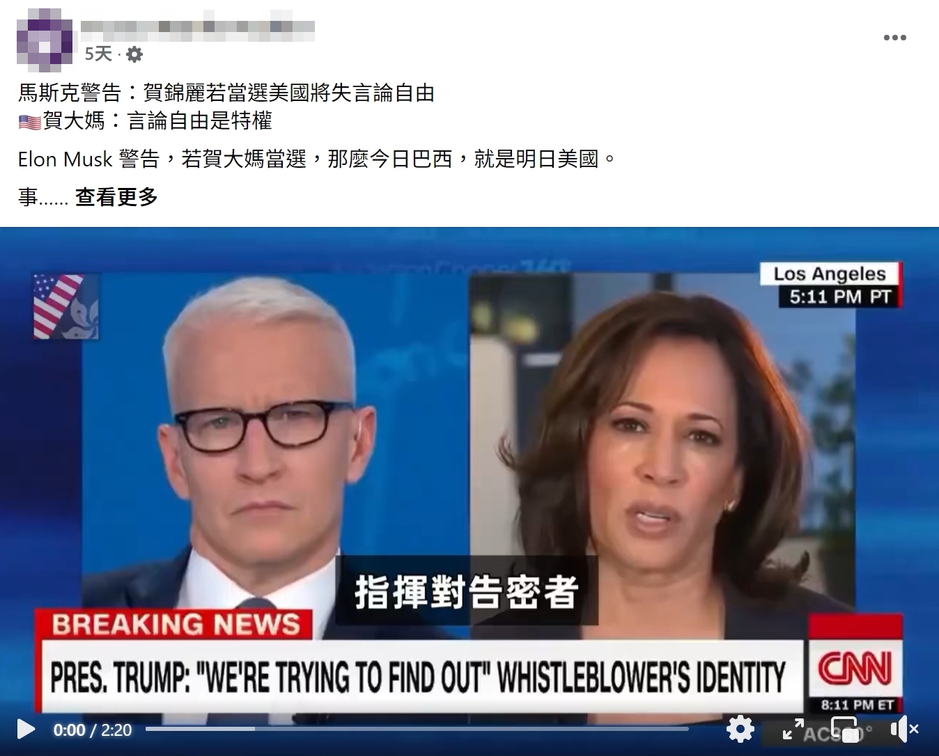 網傳「賀錦麗若當選美國將失言論自由」的影片及訊息,內容聲稱民主黨總統候選人賀錦麗(Kamala Harris)近期接受媒體訪問,表示要封鎖 X 執行長馬斯克的帳號,有打壓言論自由之嫌。經查證,網傳影片皆是賀錦麗於 2019 年針對川普的發言,與馬斯克無關。她當時要求臉書、推特等社群平台將川普帳號停權,因為他發表的言論具煽動性,且會影響數百萬人,但當時社群平台並無理會,直到 2021 年美國國會暴動後才封鎖川普,兩者之間並無直接關聯。傳言把 X 近期被巴西封鎖的新聞與賀錦麗過去的訪問結合,聲稱如果她當選,美國以後也會沒有言論自由,實則是不相關且時序不同的事件,網傳訊息容易造成民眾誤解。