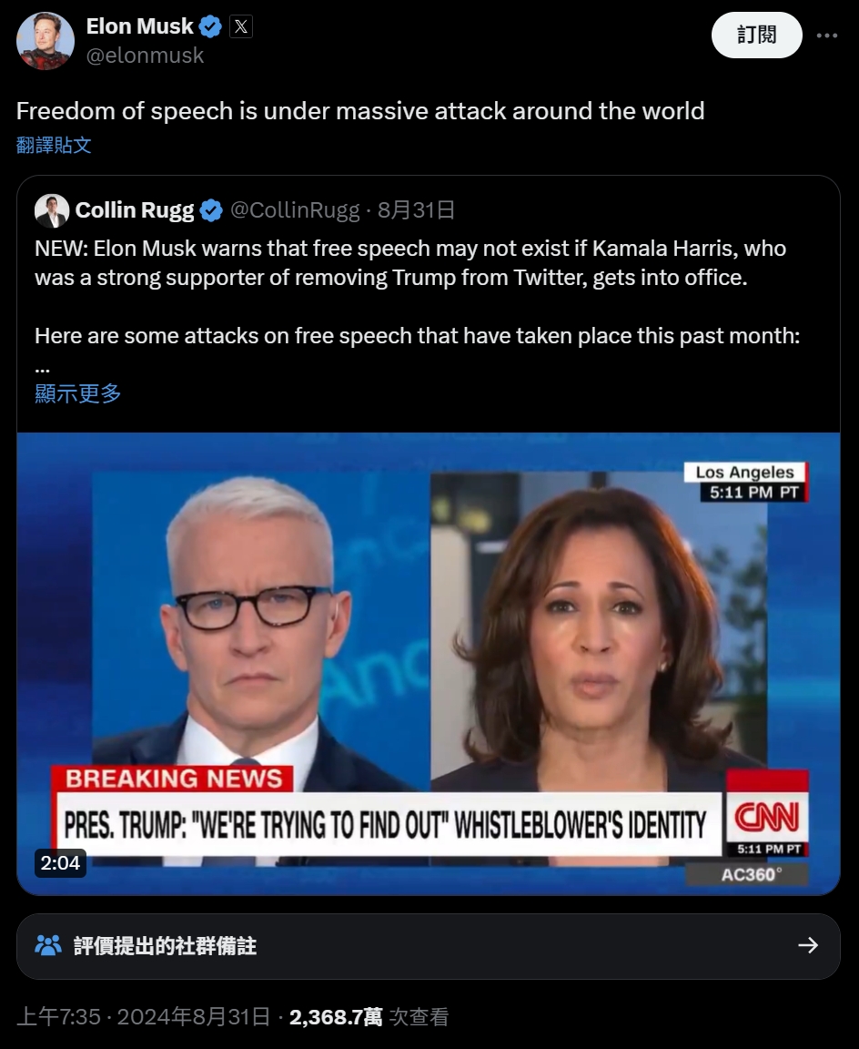 MyGoPen 利用圖片反搜工具「Google Lens」進行搜索,可以找到 X 平台用戶「Collin Rugg」於 2024 年 8 月 31 日的貼文,內容提到「馬斯克警告如果賀錦麗這名強力支持移除川普推特帳號的人當選,言論自由恐怕不復存在」,並附上一段影片,經檢視後確認與網傳影片相同。