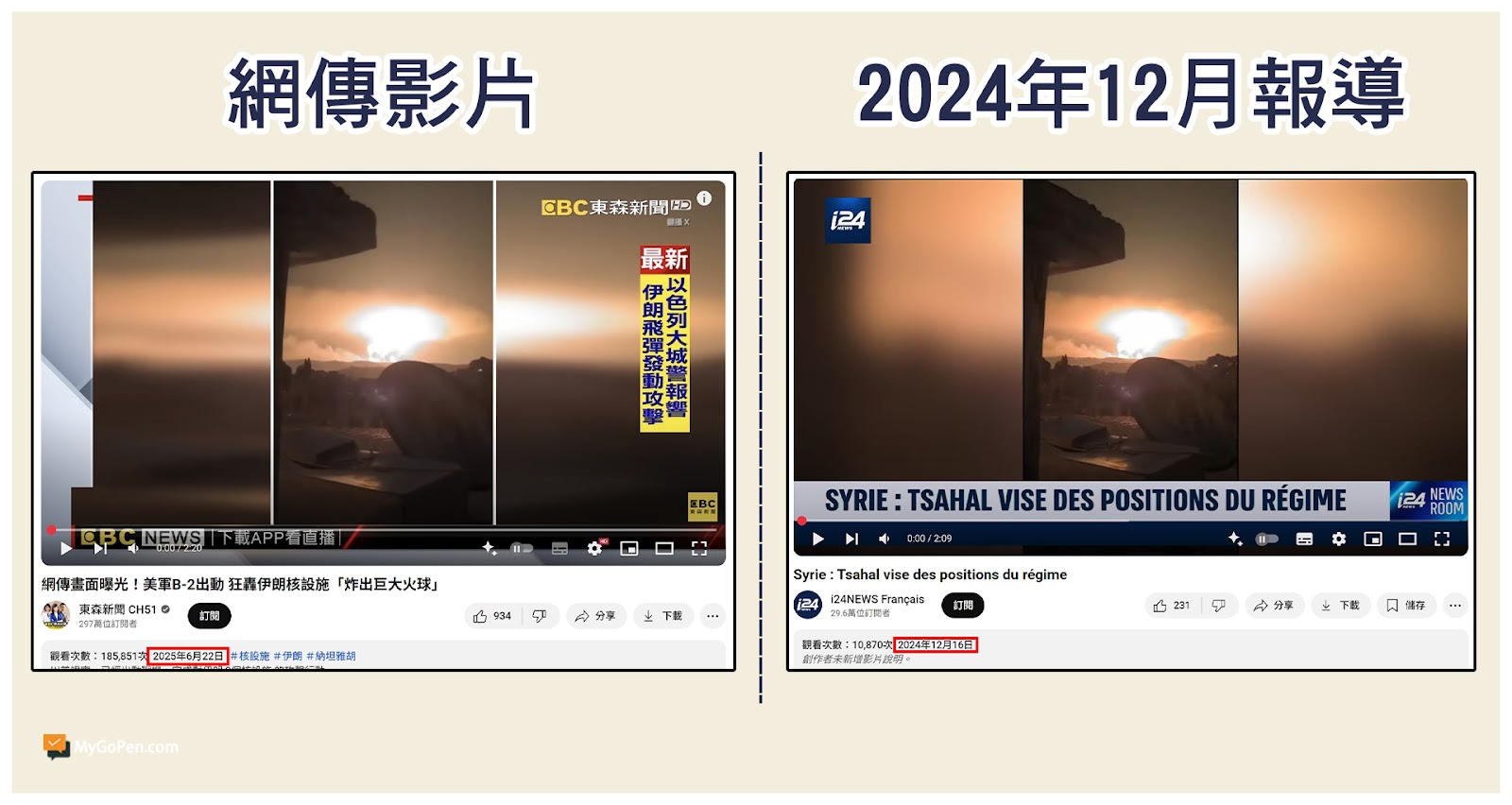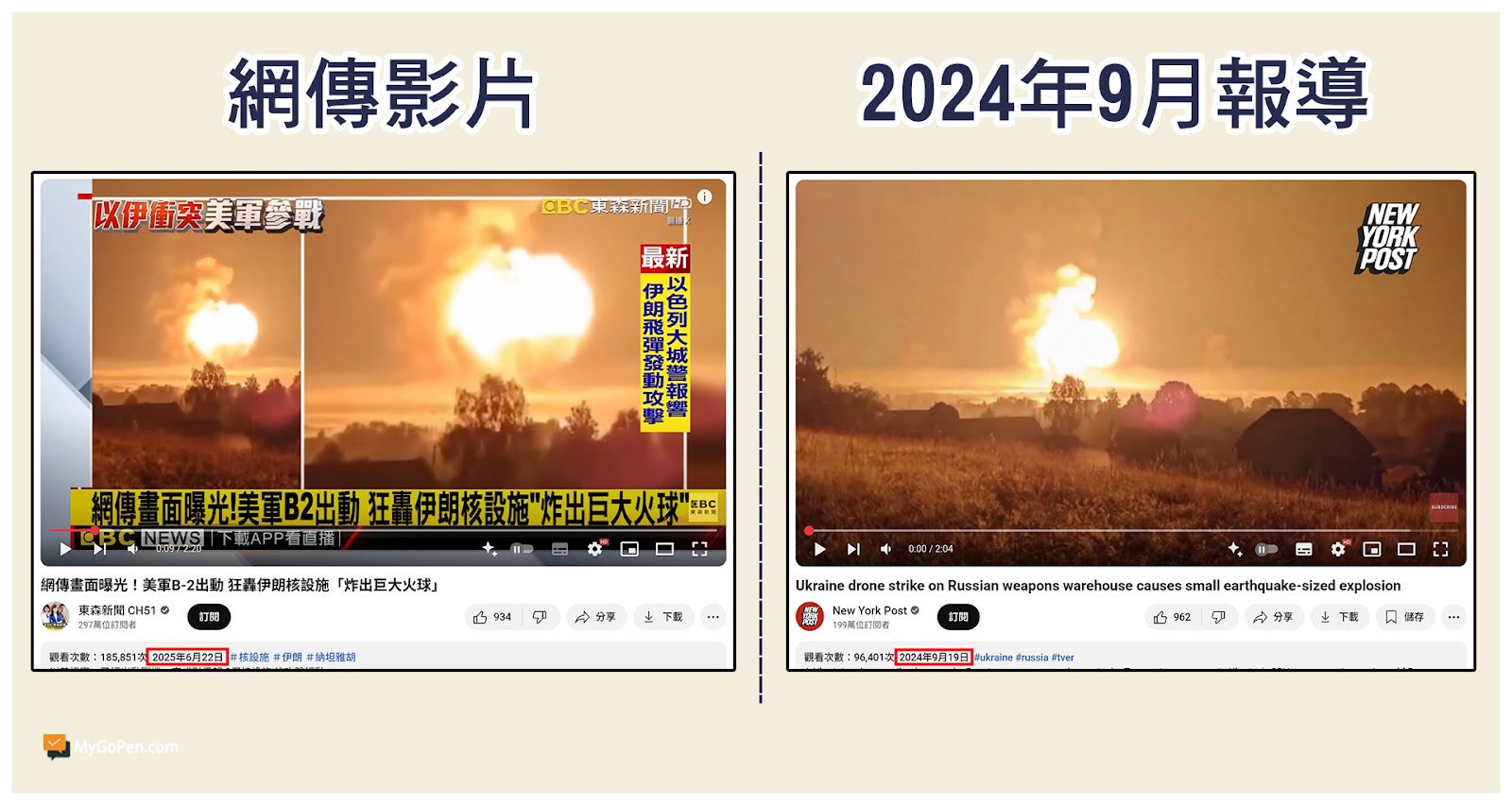 MyGoPen 檢視網傳訊息所附影片,可以找到東森新聞於 2025 年 6 月 22 日上傳官方 YouTube 頻道的報導,經檢視後確認即為網傳影片原始出處。該則報導提到網路流傳美國 B-2 轟炸機空襲伊朗核設施的片段,並放出 2 段爆炸當下的影片,後半段則是 B-2 轟炸機的資料畫面,以下將依序檢視爆炸片段的真實性。