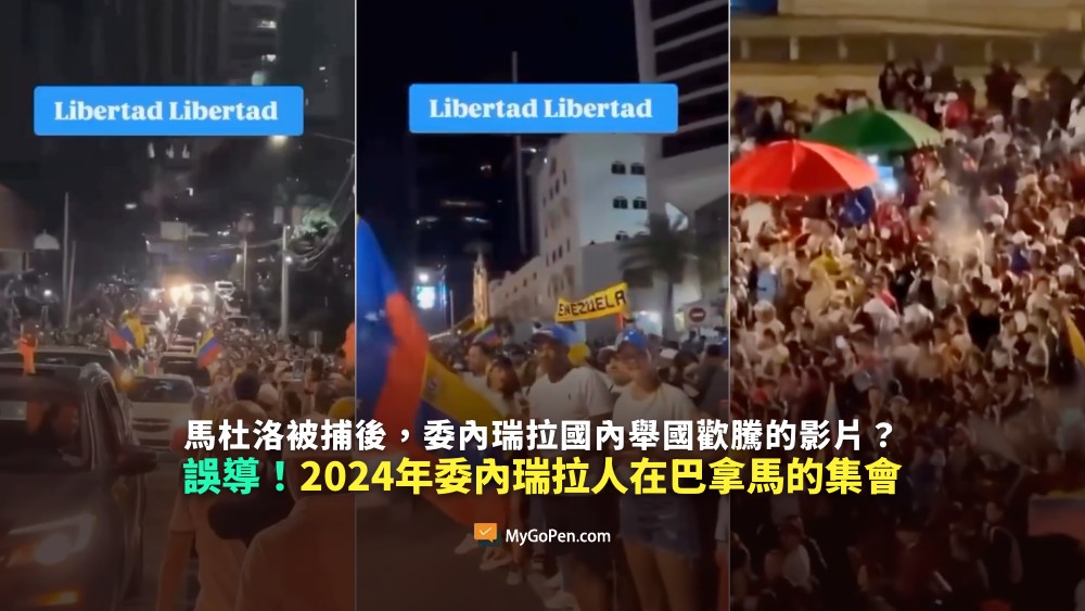 網傳「馬杜羅被捕後,委內瑞拉全國人民舉國歡騰」的訊息和影片。經查證,傳言影片早在 2024 年 7 月就已經出現在網路上,原始貼文中提到是在巴拿馬的委內瑞拉人集會畫面;根據媒體報導,當時委內瑞拉結束總統大選,馬杜洛宣布勝選,但選舉結果充滿舞弊、恐嚇的疑雲,引爆委內瑞拉全國各地的抗議浪潮,其他國家也對選舉結果產生質疑,巴拿馬因此和委內瑞拉斷交,網傳影片應為在巴拿馬的委內瑞拉人為此聲援。