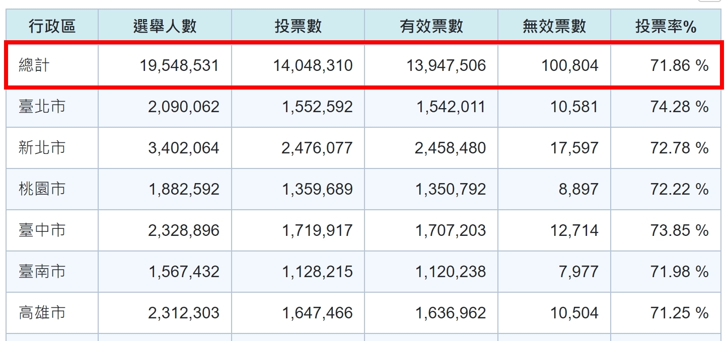 再來檢視中選會網頁的「選舉概況」,選舉人數總計 19,548,531 人,投票數 14,048,310 人,有效票 13,947,506 票,無效票 100,804 票。投票率的計算公式為「14,048,310 ÷ 19,548,531 × 100% = 71.863%」,經四捨五入後可以得知投票率為 71.86%。