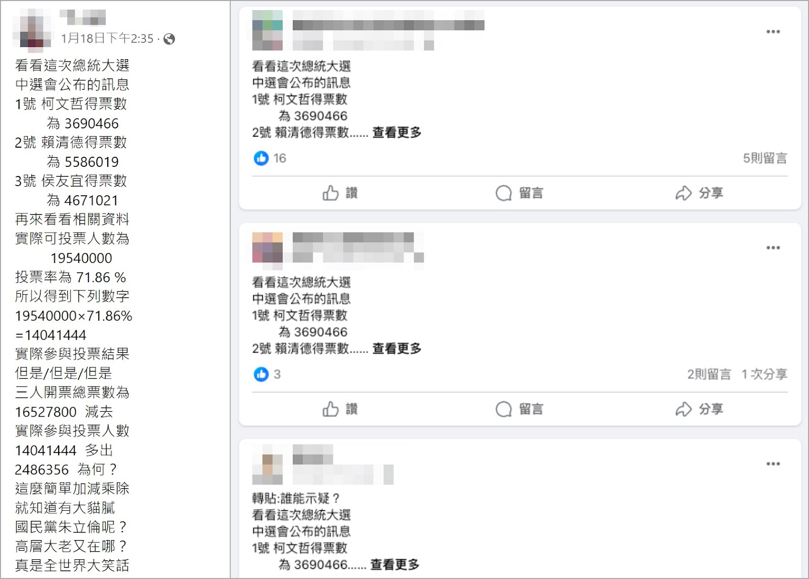 網傳「看看這次總統大選得票數」的訊息,內容聲稱 2024 年 3 名總統候選人開票總數為 16,527,800 人,但是依中選會公布的數據計算,投票人數為 1,400 多萬人,兩者相差 200 多萬票,質疑有作票嫌疑。經查證,本次總統副總統選舉人數總計 19,548,531 人,投票數 14,048,310 人,有效票 13,947,506 票,投票率 71.86%,傳言已簡化後的選舉人數及投票率計算,因此得出不準確的數據;3 名候選人總計票數是 13,947,506 票,並非 1,652 多萬票,傳言聲稱選舉結果與中選會公布資料有落差的說法,沒有事實依據,網傳訊息不正確。