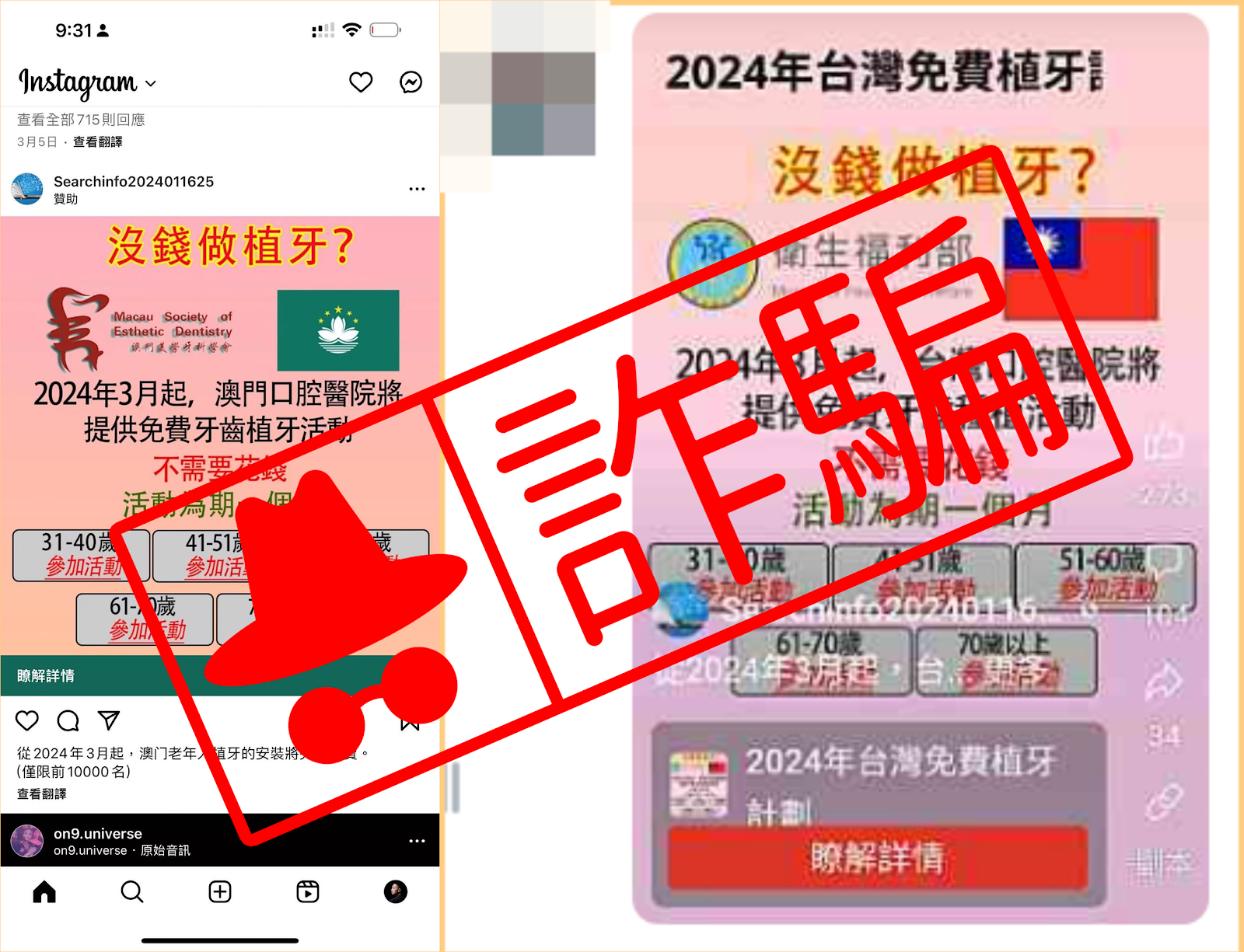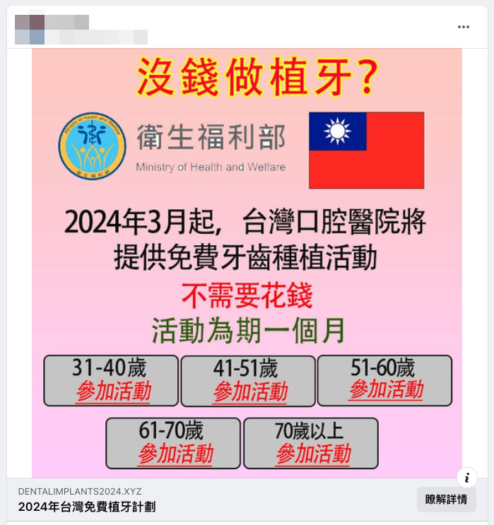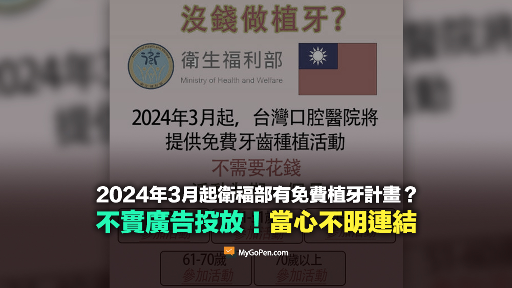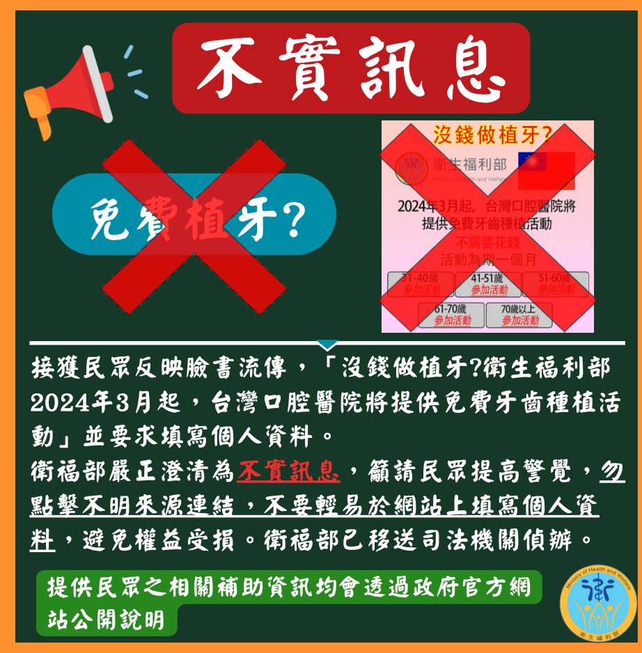 經查證,衛福部在官網特別澄清這樣的不實資訊,衛福部接獲民眾反映臉書流傳,「沒錢做植牙?衛生福利部 2024 年 3 月起,台灣口腔醫院將提供免費牙齒種植活動,不需要花錢」。衛福部嚴正澄清為不實訊息,籲請民眾提高警覺,勿點擊不明來源連結,不要輕易於網站上填寫個人資料,避免權益受損。衛福部已移送司法機關偵辦。