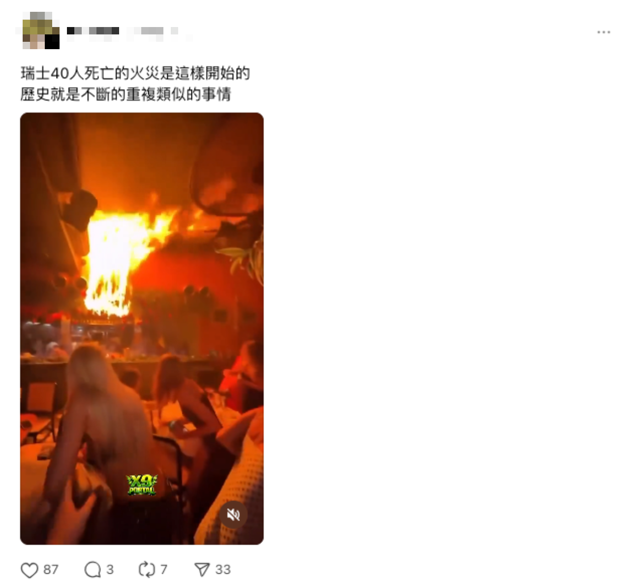 網傳「瑞士 40 人死亡的火災是這樣開始的」、「歷史就是不斷的重複類似的事情」的訊息和影片。經查證,傳言影片實為印尼峇里島一間叫做 Bella Canggu 的餐廳在 2025 年 12 月 23 日發生火災,當時工作人員正在進行火舞表演,疑似是引燃了周圍的裝飾物導致大火,所幸無人傷亡,和瑞士一間酒吧在 2026 年跨年夜發生嚴重大火無關,傳言為錯誤訊息。