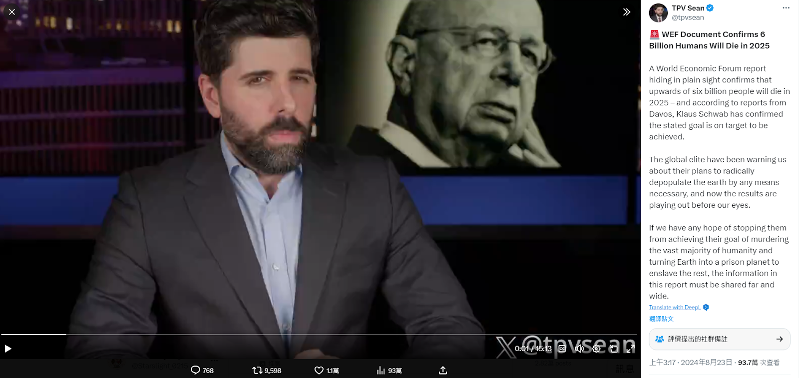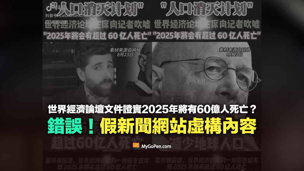 網傳「世界經濟論壇文件證實 2025 年將有 60 億人死亡」的訊息和影片。經查證,影片為假新聞網站「The People's Voice」主持人 Sean 所發布,並不存在傳言所述的世界經濟論壇文件,傳言純屬虛構;該網站以散布陰謀論及假訊息聞名,過去多透過文字來傳播,現在除了文字還會額外製作影片,但其敘述均無任何根據,缺乏可信度。