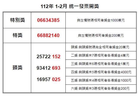 財政部25日開出112年1、2月期統一發票獎號,開獎資訊為,1000萬特別獎號碼06634385,200萬元特獎號碼66882140,20萬頭獎號碼25722152、93412693、16957025。