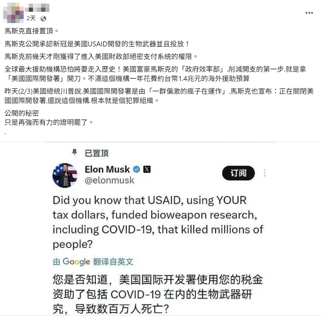 網傳「馬斯克公開承認新冠是美國開發」的圖片及訊息,聲稱特斯拉創辦人馬斯克(Elon Musk)近期發布推文,承認新冠病毒是美國國際開發署(USAID)資助研究的生物武器,並因此導致數百萬人死亡。經查證,美國國際開發署曾資助過生態健康聯盟(EcoHealth Alliance),生態健康聯盟曾與武漢病毒實驗室合作研究蝙蝠冠狀病毒,馬斯克因此將兩件事聯結,但沒有提出進一步的資料佐證。事實上,目前沒有明確證據顯示新冠病毒(COVID-19)是由實驗室洩漏,也沒有百分之百證據可以排除不是由實驗室洩漏,馬斯克的貼文用字遣詞過於簡略,未說明實際情況,也未提出新事證,容易造成民眾誤解。
