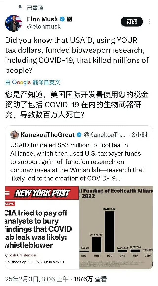 馬斯克直接置頂。 馬斯克公開承認新冠是美國USAID開發的生物武器並且投放! 馬斯克前幾天才剛獲得了進入美國財政部絕密支付系統的權限。 全球最大援助機構恐怕將要走入歷史!美國富豪馬斯克的「政府效率部」.削減開支的第一步.就是拿「美國國際開發署」開刀。不滿這個機構一年花費約台幣1.4兆元的海外援助預算 昨天(2/3)美國總統川普說.美國國際開發署是由「一群偏激的瘋子在運作」.馬斯克也宣布:正在關閉美國國際開發署.還說這個機構.根本就是個犯罪組織。 公開的秘密 只是再強而有力的證明罷了。