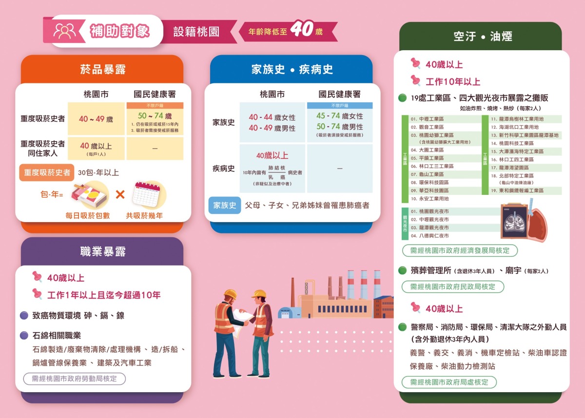 衛生局表示,桃園市擴大肺癌篩檢原針對市政府環保局有佈建空氣感測器之13處工業區,包含中壢工業區、觀音工業區、桃園幼獅工業區(含桃園幼獅擴大工業用地)、大園工業區、平鎮工業區、林口工三工業區、龜山工業區、環保科技園區、華亞科技園區、永安工業用地、龍潭烏樹林工業用地、海湖坑口工業用地及新竹科學工業園區龍潭基地;為照顧廣大工業區工作人口,再新增6處工業區,包含桃園科技工業區、大潭濱海特定工業區、林口工四工業區、龍潭渴望園區、北部特定工業區(龜山中油煉油廠)及東和鋼鐵報編工業區。凡設籍桃園市且40歲以上於這19處工業區工作10年以上者,即可以公司為單位向市政府經濟發展局提報列冊,經核定後,至衛生局肺癌篩檢預約平台預約申請。