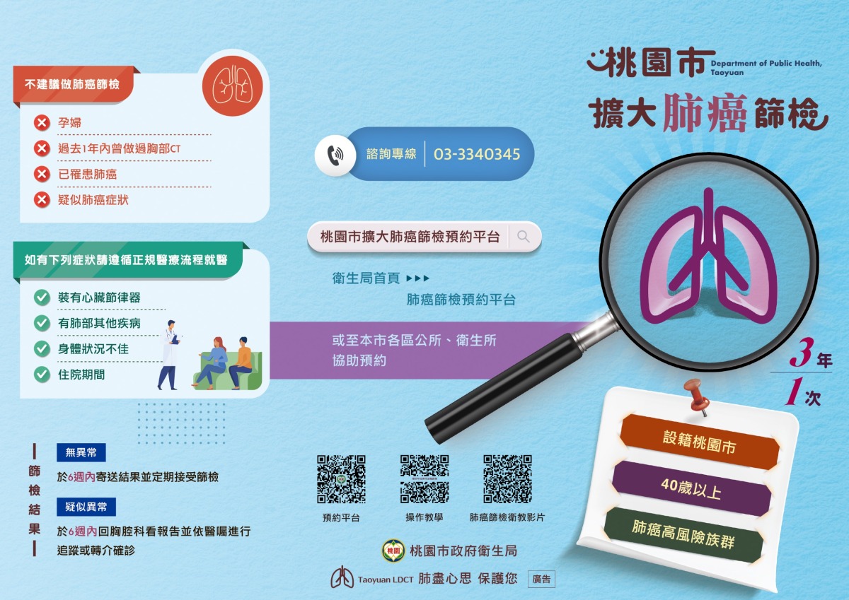 衛生局呼籲,如符合篩檢資格,請儘早接受篩檢,若篩檢出肺部異常,也應遵循醫囑安排就診。更多肺癌篩檢相關訊息,可至桃園市政府衛生局首頁查詢,或撥打衛生局擴大肺癌篩檢諮詢服務專線03-334-0345洽詢。