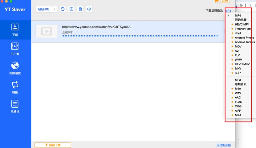 下載完成後,可看到畫面左上方有一個「黏貼URL」,你只要把YouTube或Facebook等平台的影片網址貼上去,並選擇想要轉換的規格就可以等待輸出了,當你購買YT Saver就可以將影片轉成MP4、MP3、MOV、AAC、WAV等多規格的影片。