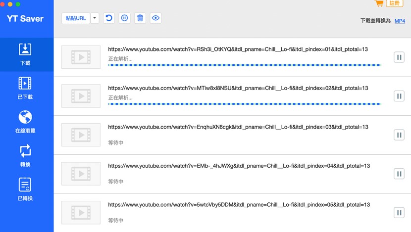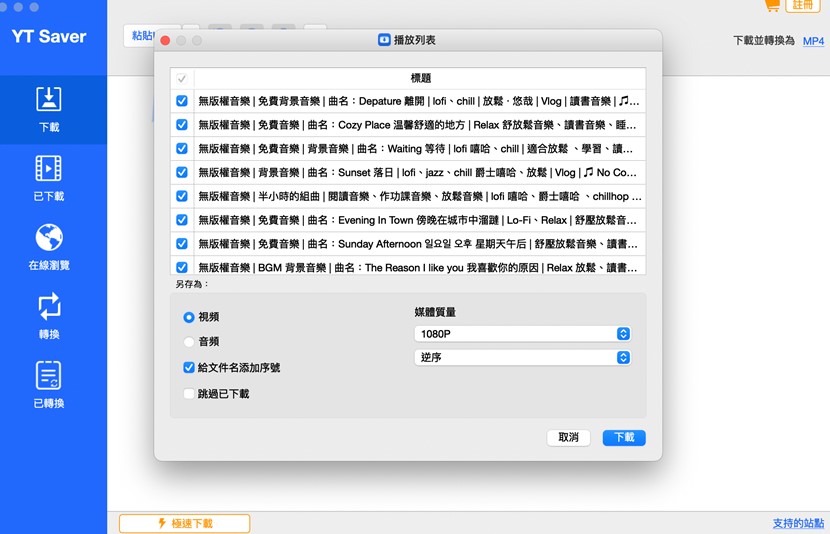 除此之外,YT Saver還有一個很棒的功能是能下載「播放列表」,同樣將YouTube上的播放列表網址貼至剛剛的「黏貼URL」即可一次下載所有列表中的歌曲,甚至可以跳過已下載的影片,是一個非常人性化的設計!