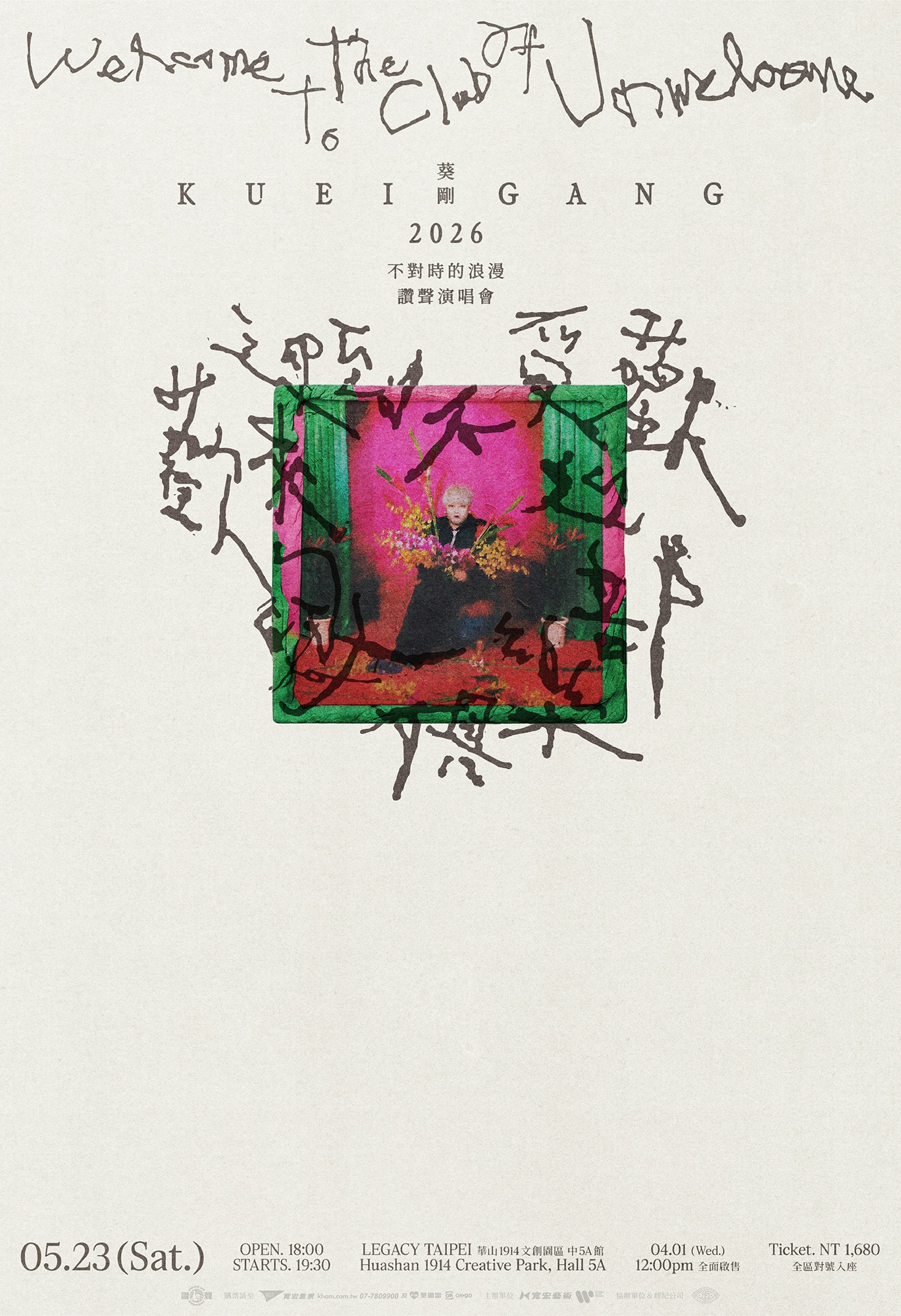 打造「同類」專屬的棲息地!唱作新勢力葵剛 Kuei Gang 正式宣告將於 5 月 23 日於台北 Legacy,舉辦全新專場2026【歡迎來到不受歡迎的人俱樂部】不對時的浪漫讚聲演唱會。演出升級為全樂團編制,透過溫柔卻厚實的音牆,為大家撐起一個更巨大的專屬空間,邀請所有與世界錯頻的靈魂走進現場。