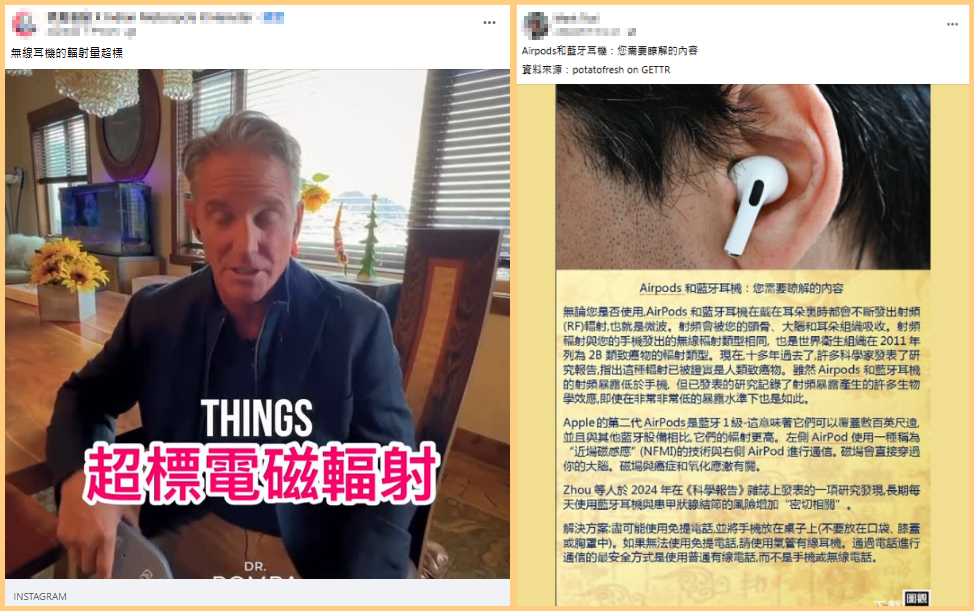 網傳「無線耳機」、「手機傷害大腦 電磁場 EMF」等影片,提到無線耳機 EMF 超標、不安全等。但環境部官網、醫師專家都表示,電磁波分為「非游離輻射」Non-ionizing radiation、「游離輻射」ionizing radiation 兩類,都是電磁波、都有輻射字眼,不但英文常混淆,連帶的中文也常混淆,但其實以中文口語來說,手機、耳機、微波爐所屬的「非游離輻射」通常稱為「電磁波」,而 X 光是「游離輻射」通常稱為「輻射」、「放射線」,傳言 EMF radiation 的說法並不好、易生誤導,比較正確的說法應為用字完整的 EMF Non-ionizing radiation、中文為「電磁場非游離輻射」,傳言省略關鍵的頻譜分類背景知識、以及各種 3C 其實都有電磁波的事實,傳言說法錯誤。