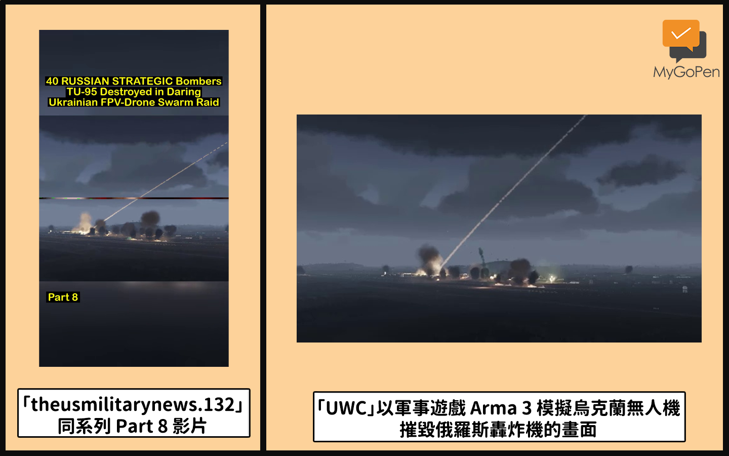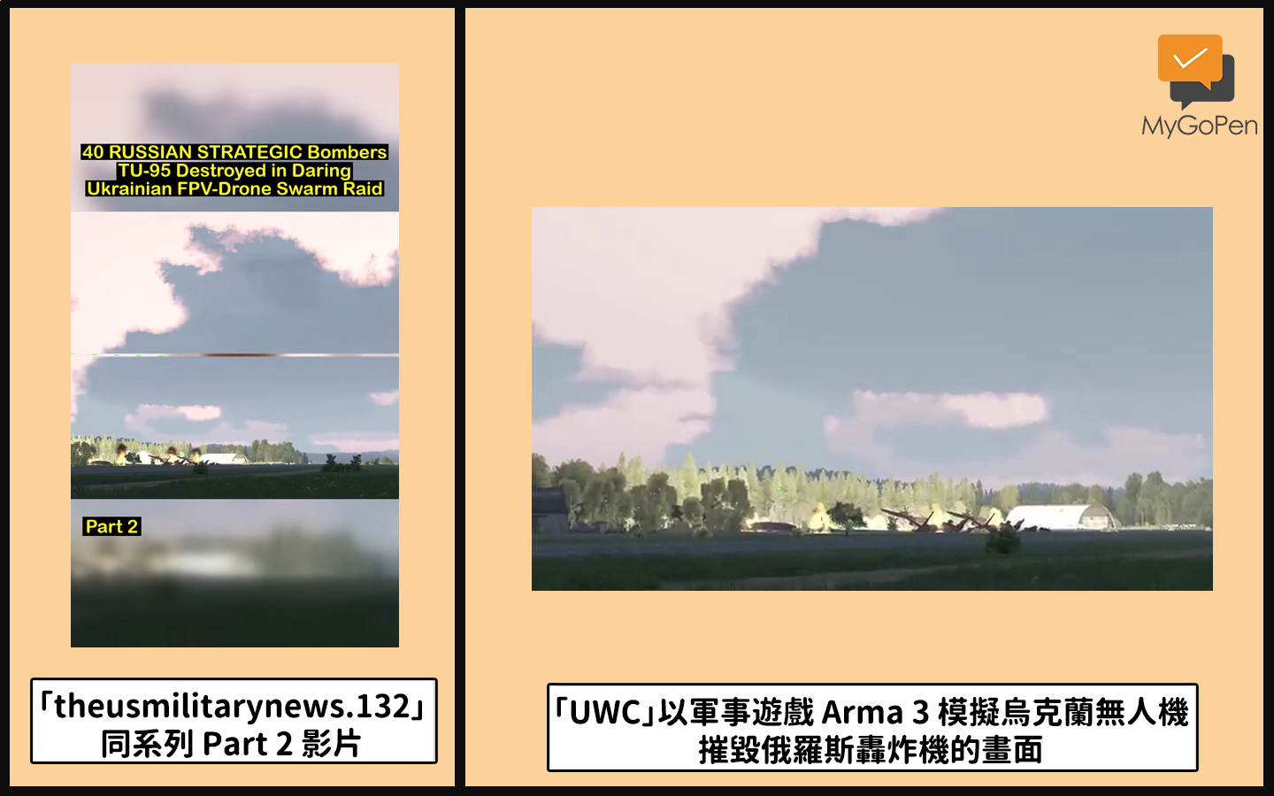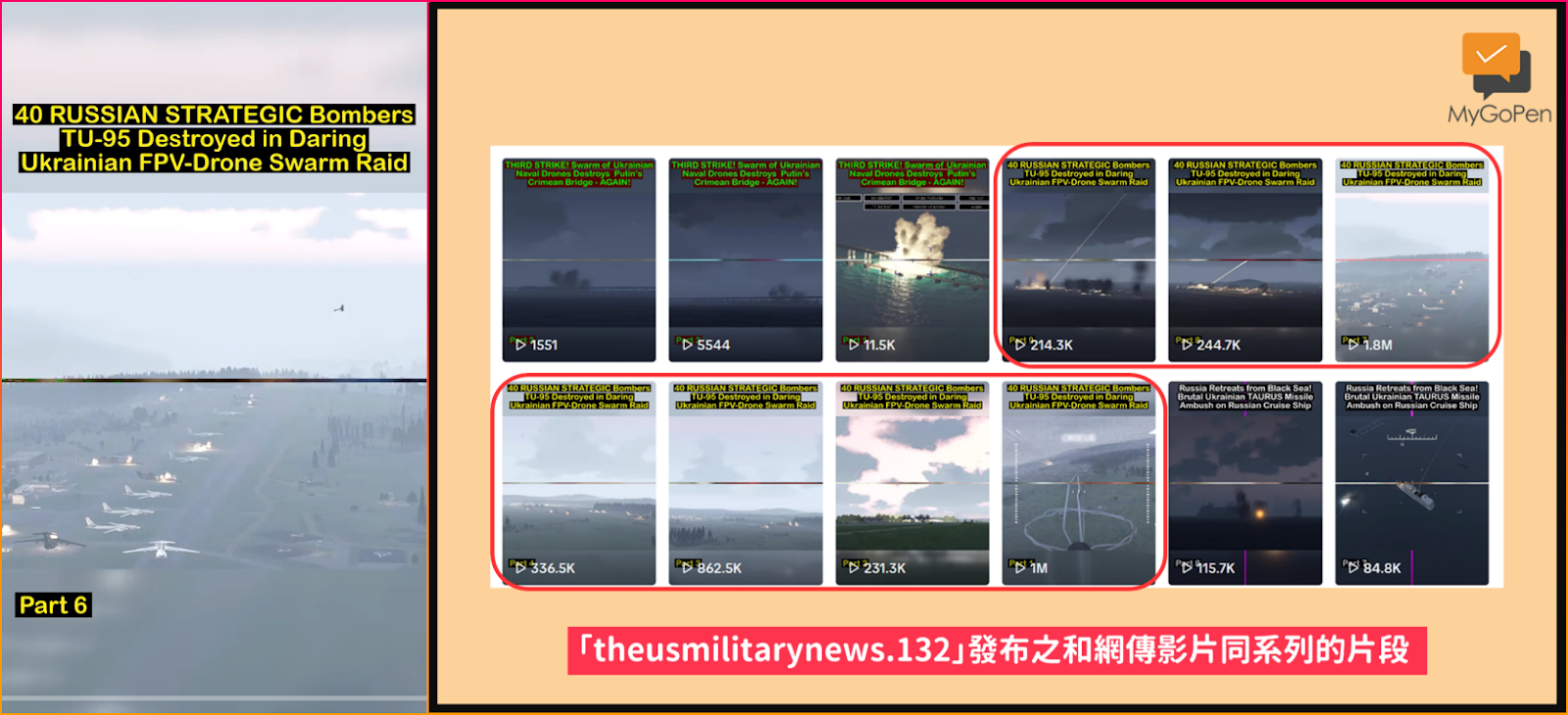 (三)以「theusmilitarynews.132」同系列的其他片段進行反搜,查找到 YouTube 頻道「UWC」在 2025 年 6 月 1 日上傳了一則 20 分鐘的影片,標題為:「40 架俄羅斯戰略轟炸機 TU-95 在的烏克蘭大膽的無人機群突襲中被摧毀」(40 RUSSIAN STRATEGIC Bombers TU-95 Destroyed in Daring Ukrainian FPV-Drone Swarm Raid)。