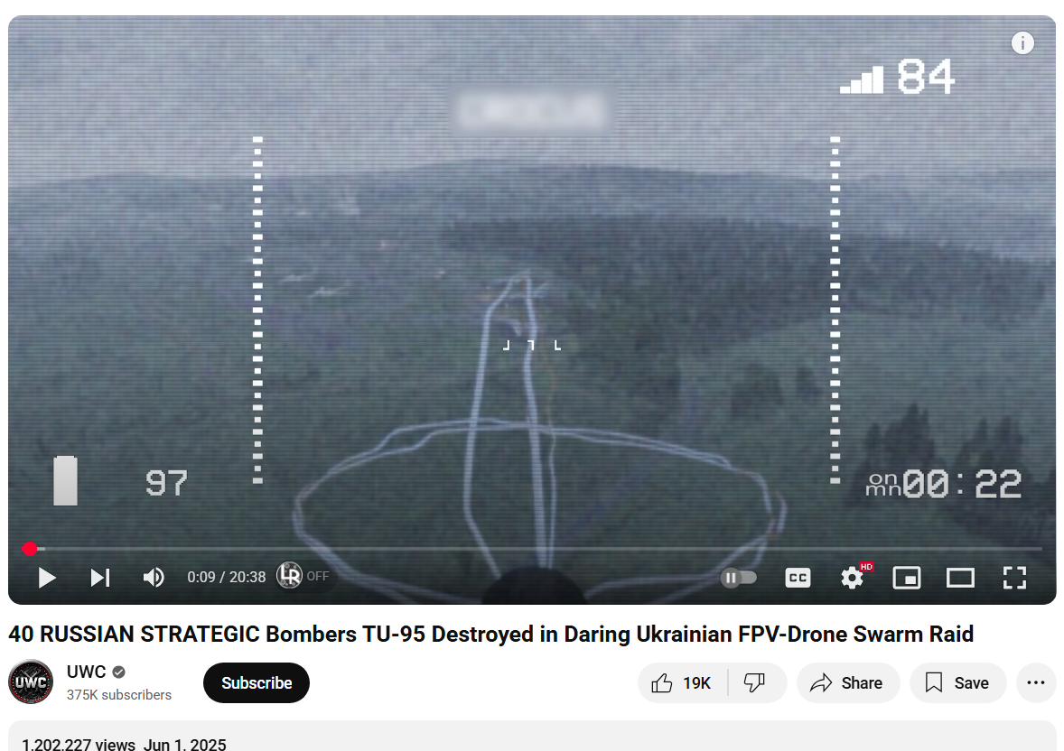 UWC YouTube - 40 RUSSIAN STRATEGIC Bombers TU-95 Destroyed in Daring Ukrainian FPV-Drone Swarm Raid