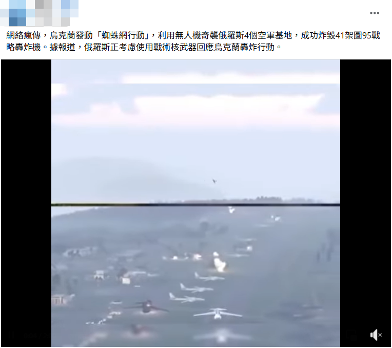網傳「俄 41 架戰略轟炸機是怎樣被幹掉的」、「烏克蘭發動『蜘蛛網行動』,利用無人機奇襲俄羅斯 4 個空軍基地,成功炸毀 41 架圖 95 戰略轟炸機」的訊息和影片。經查證,烏克蘭確實在近日成功襲擊俄羅斯空軍基地,這項代號為蜘蛛網的行動將無人機走私至俄羅境內後發動攻擊,共動用 117 架無人機,結合 AI 和人工操作,造成俄國 41 架軍機全毀或半毀;但網傳影片並非蜘蛛網行動的真實影像,而是 YouTube 頻道「UWC」以軍事遊戲 Arma 3 模擬的畫面,傳言為誤導訊息。